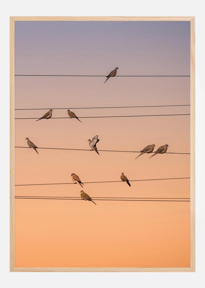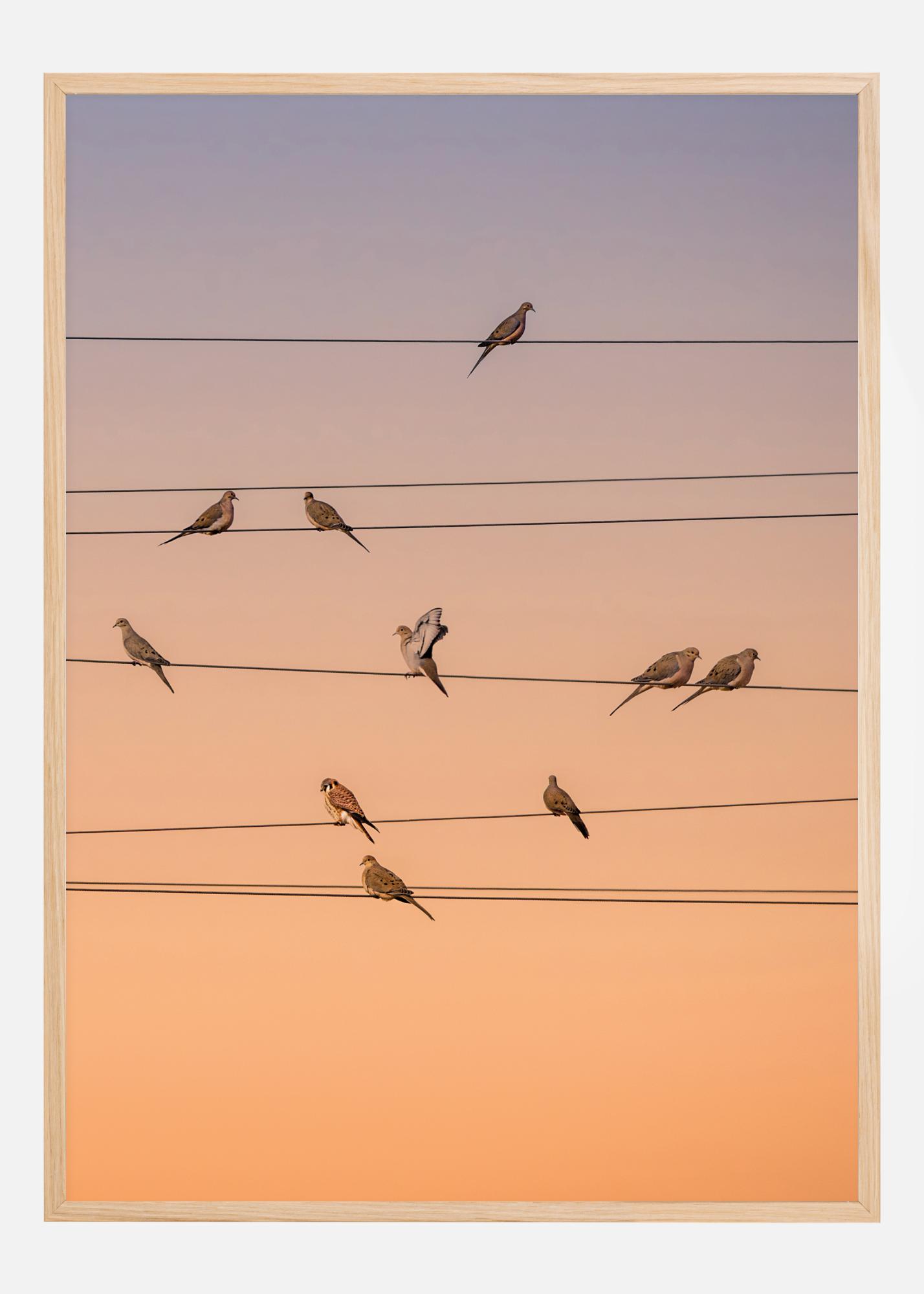 An amazing print of birds on perching on electricity cables. Illuminated by the orange evening orb, the cables form patterns like those of a music sheet. The imaginary music sheet gives a perfect feeling of the birds singing. Ready for any living room wall.