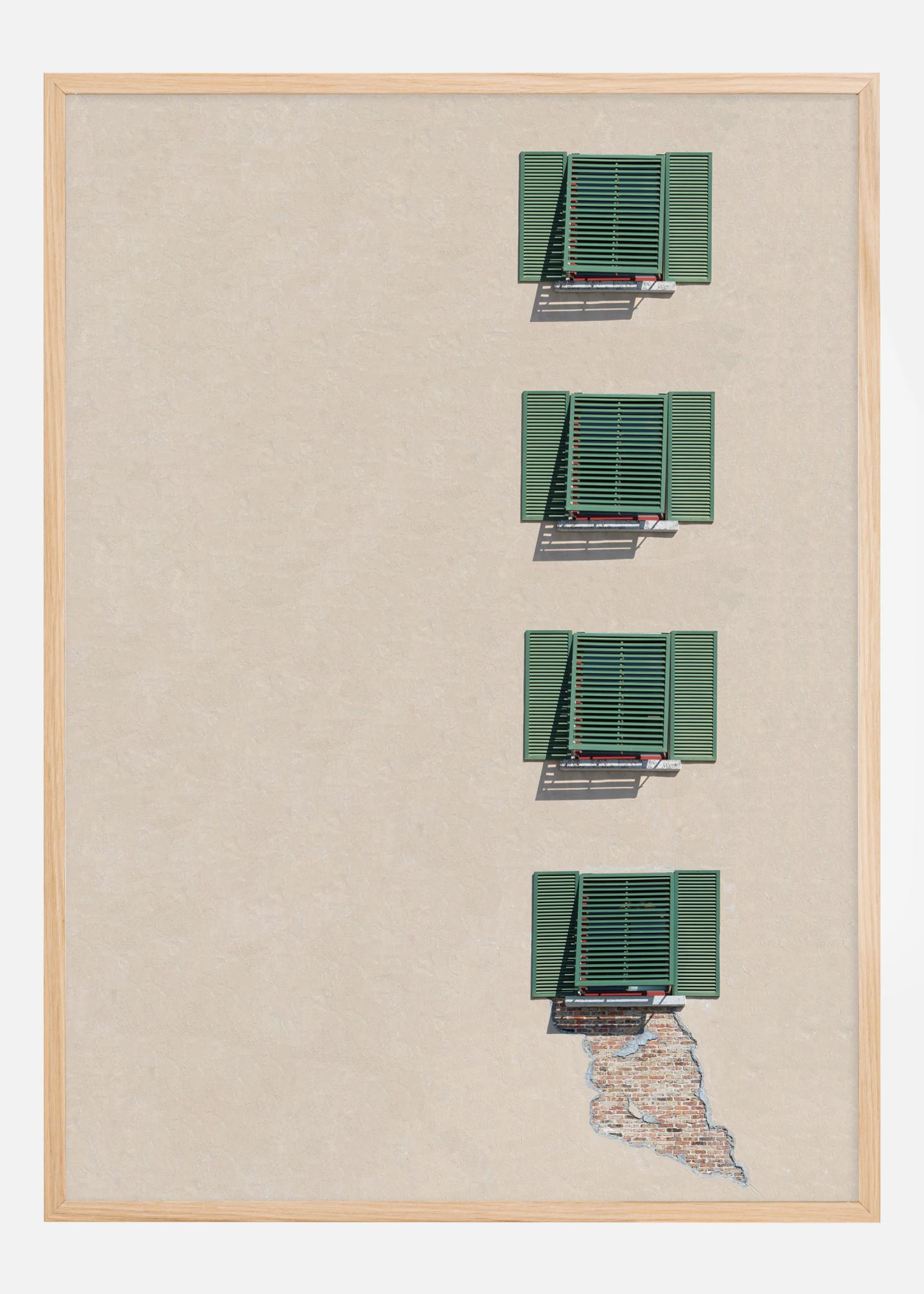 The work, which may have the title "Neighbour Quarrel," presents a radical contrast between order and chaos through the synchronized shutters in comparison to the last window where part of the wall appears to have collapsed. The uniform shutters in green against the monochrome background indicate a type of predictability and routine, while the damaged window with the exposed bricks breaks this harmony and introduces a story of possible conflict or neglect.