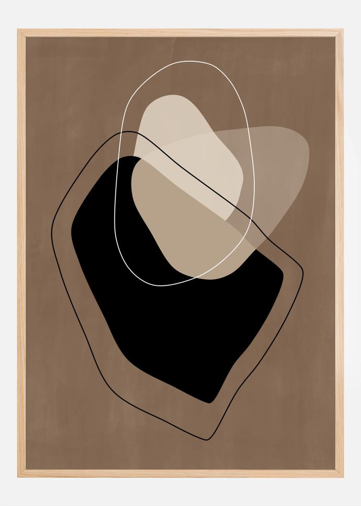This poster combines the aesthetic clarity of geometric abstraction with a warm and inviting color palette. It presents a creative interplay between dark and light shades, where bold black shapes contrast with soft white lines and beige and taupe-colored fields. This constellation of elements is enclosed by a thin, white perimeter that creates an illusion of space and depth. This poster is perfect for those who appreciate modern design and seek an artwork that blends contrasting colors and shapes in a way that is both thought-provoking and aesthetically pleasing.