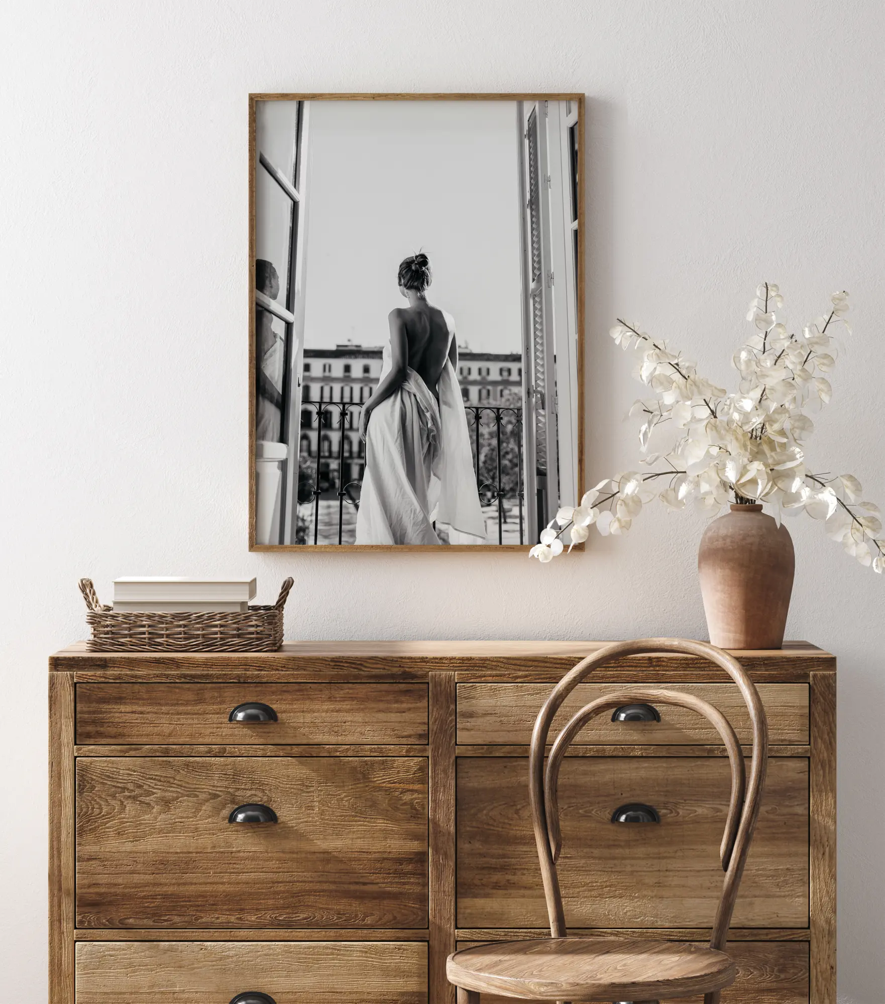 A sexy black and white close-up print of a woman with white towel standing on a balcony. With her hair tied in a bun, the woman seems to be admiring the view. The reflection of the woman in the window creates a sensual print. A sensual yet beautiful print to hang on your bedroom wall.