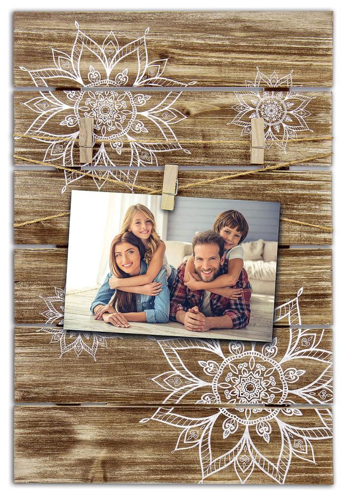 This is a beautiful collage picture frame, where your pictures are held in place with decorative wooden clips. Your pictures are mounted against a wooden background with a bohemian design of white flowers. This picture frame has space for two pictures measuring 10x15 cm. This frame's outer measurements are 32x48,5 cm. This collage picture frame goes great together on the wall with other frames, creating a stylish ensemble in your home. Comes with wall fixings.