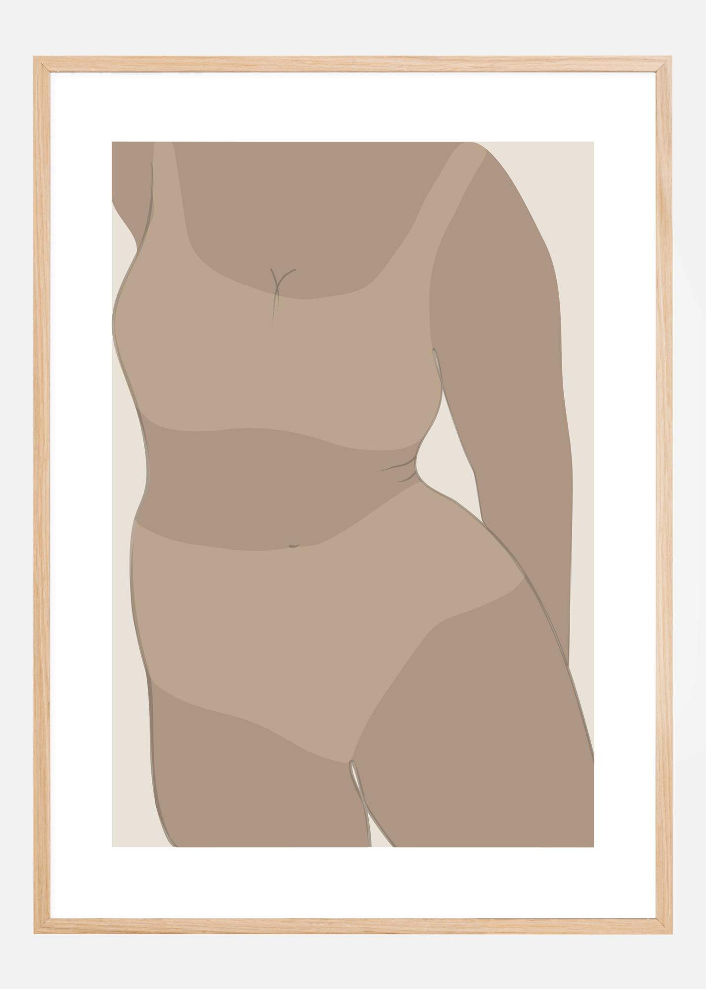 A beige coloured poster of a woman in her underwear. Set on a light beige background, the light-brown curvy thighs and a little cleavage separates the breasts. A simple print to show the beauty of a woman in her underwear. Admire the beauty of this woman.