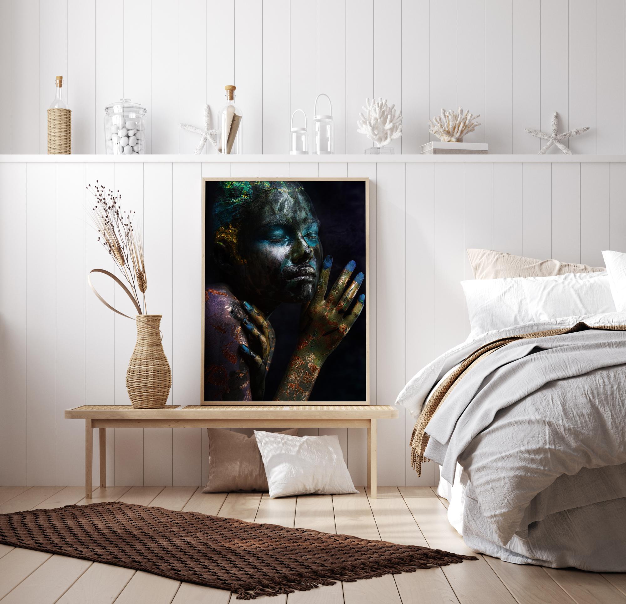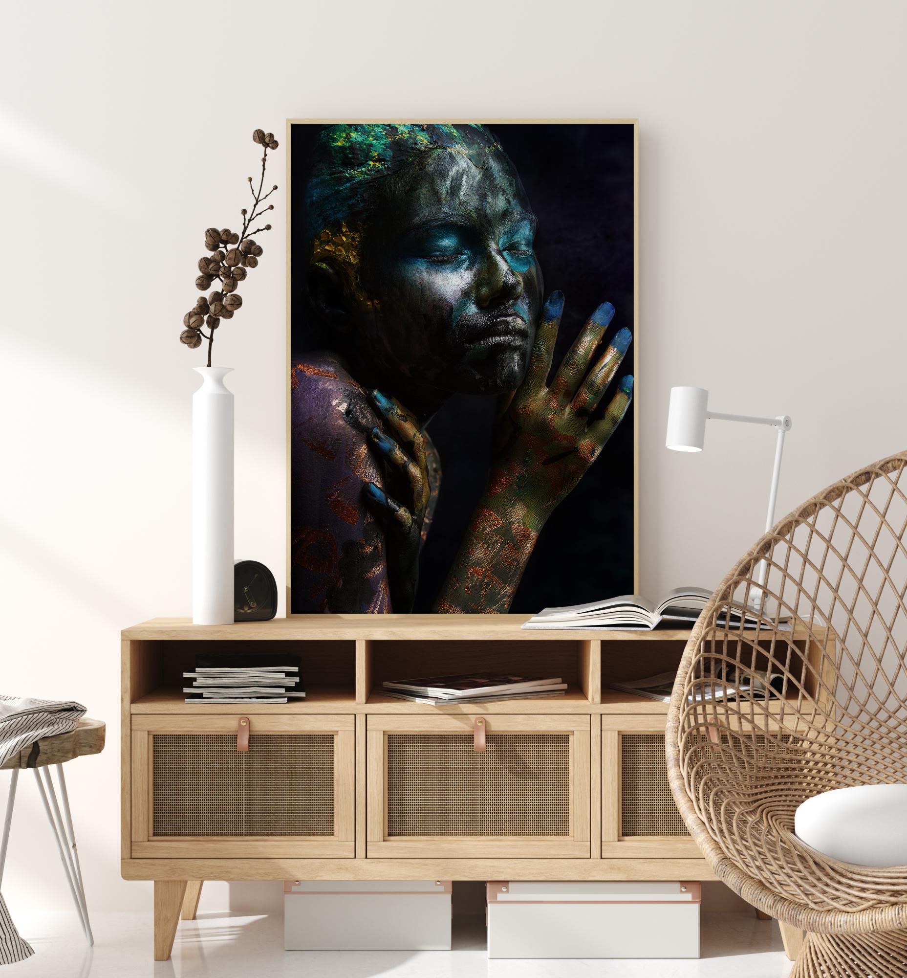 A breath-taking print of a woman covered in paint. Set on a black background, the woman has been covered in bright coloured paints. With the natural light shining on the woman's face and shoulders, the intensity of the colours is highlighted. A beautiful print to add colour to a white wall.