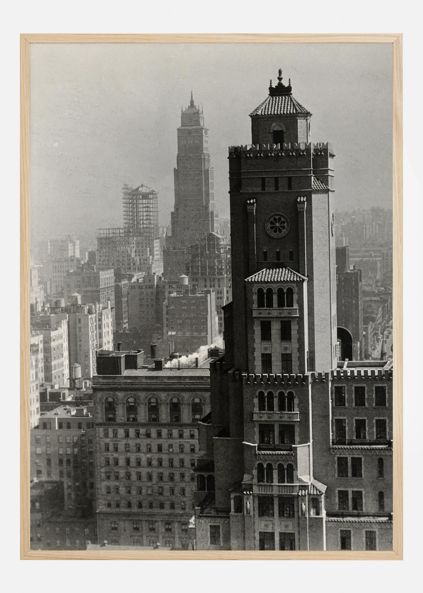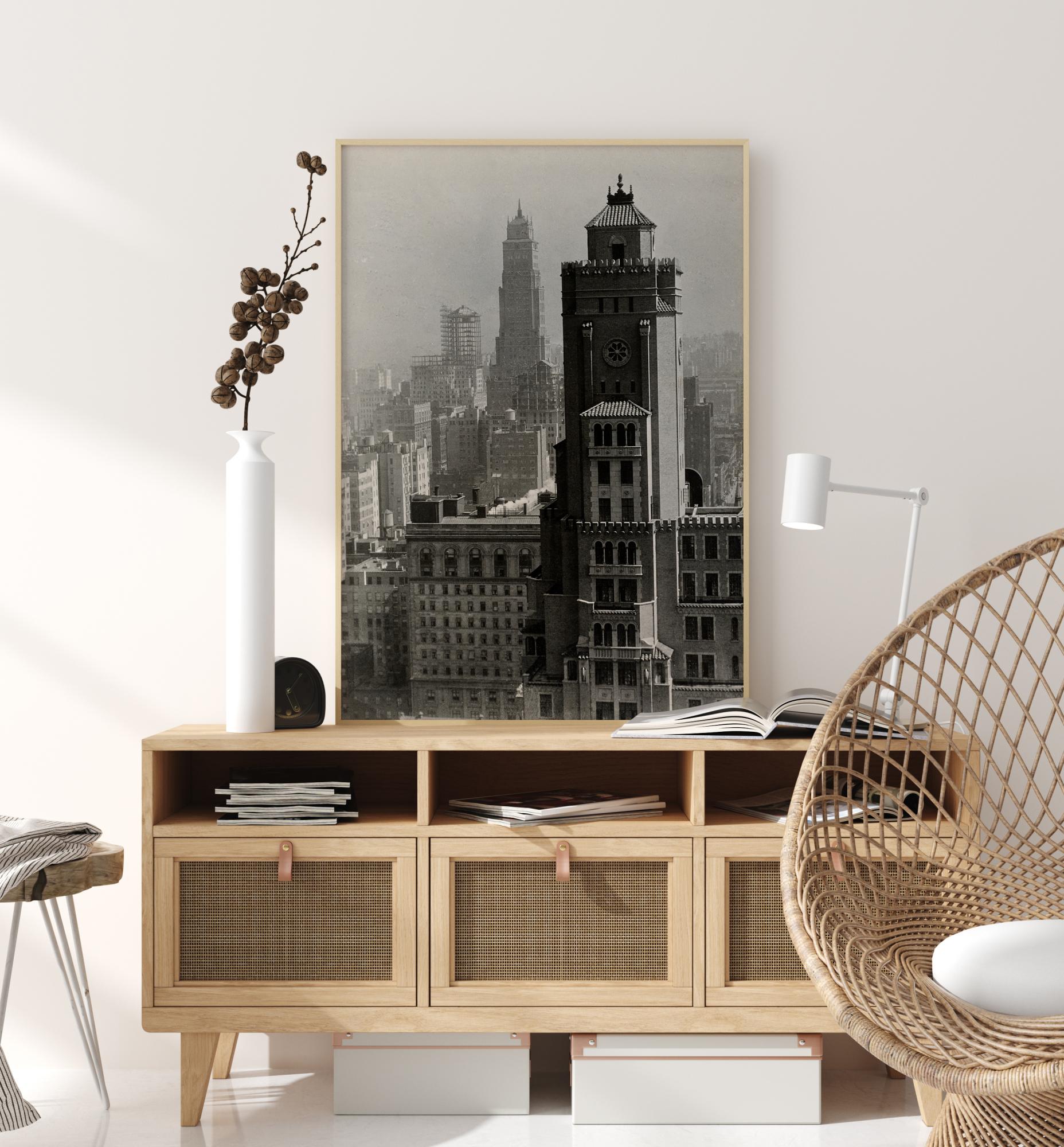 A black and white print of an old town. The grey skyline blends in perfectly with the same grey coloured buildings. The town is made up of buildings of different heights. In the foreground, the natural light shines directly onto the east side of the main building. Hang this print in your study and observe the old town.