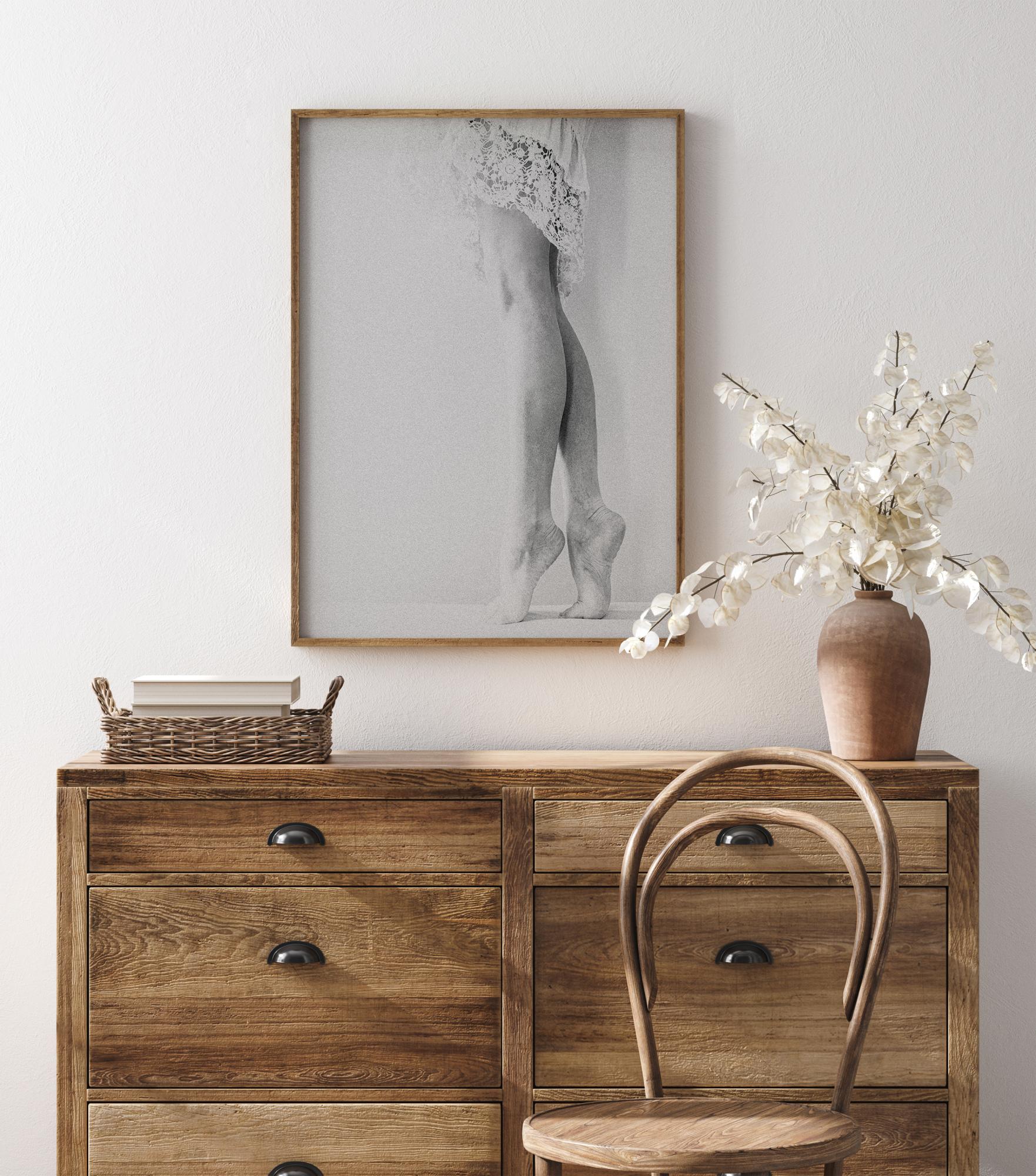 An elegant half portrait of a woman on her tip toes. The simplicity of this image combined with the subtle white makes this an excellent addition to your bedroom or living room.