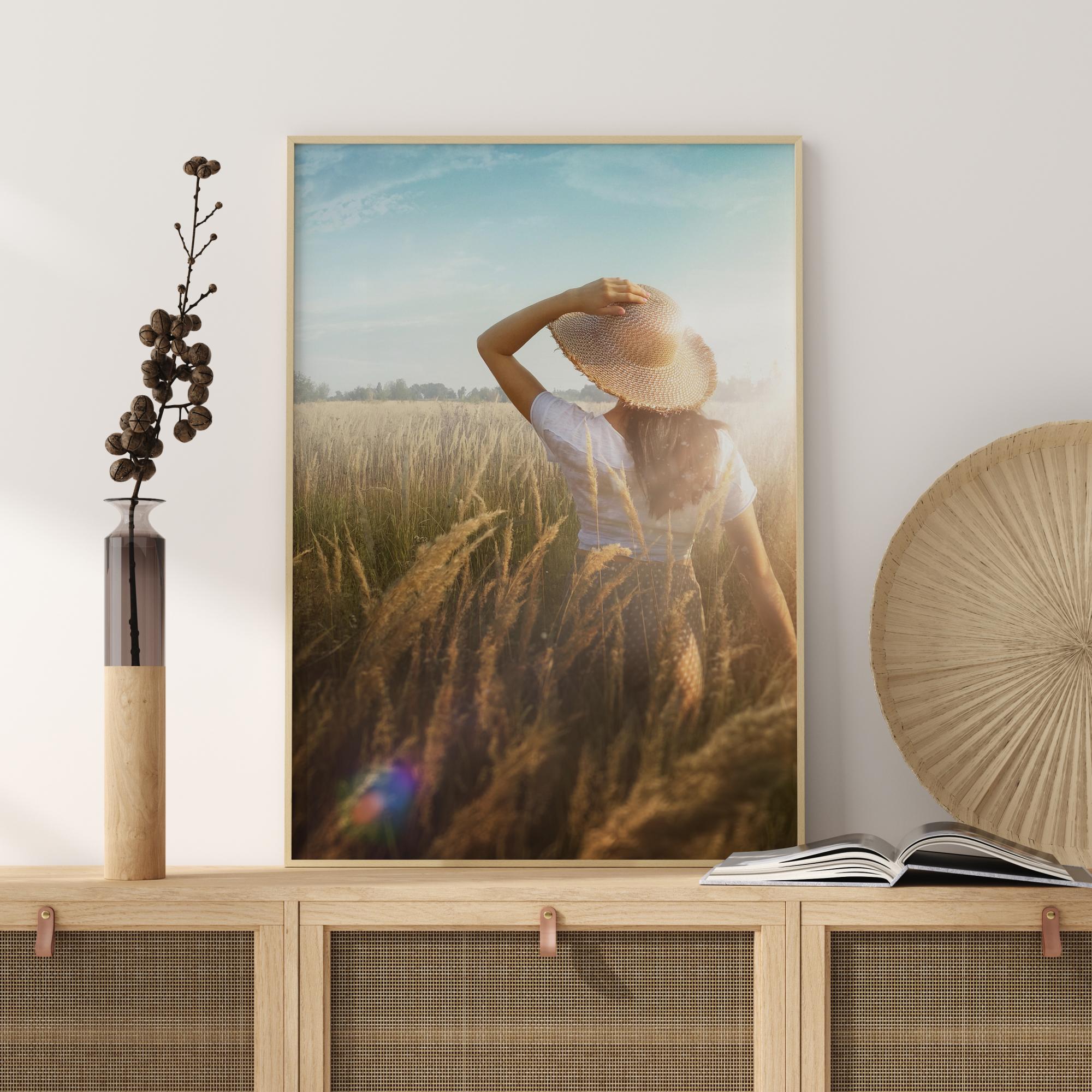 A relaxing and fresh print of a woman in a straw hat in the wheat fields. The beautiful blue sky meets the golden wheat field. With her hand placed on her head, a young woman strolls through the fields enjoying the fresh air. An ideal print for anyone who appreciates the beauty of nature.