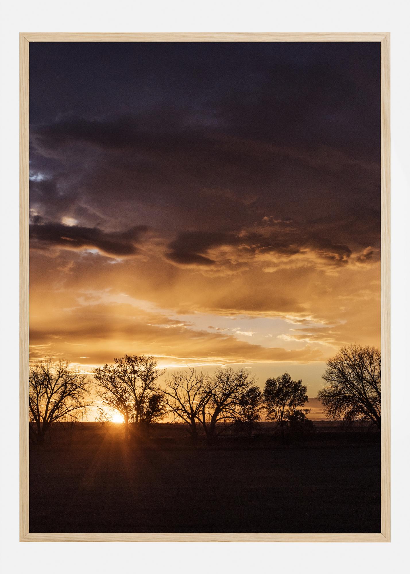 A breath-taking print of an orange sunset. The sunset on the horizon enhances the autumn tress in the fields. With a spectacular sky, the shades of orange create a warm and soothing atmosphere. A stunning print to bring warmth into your living room.
