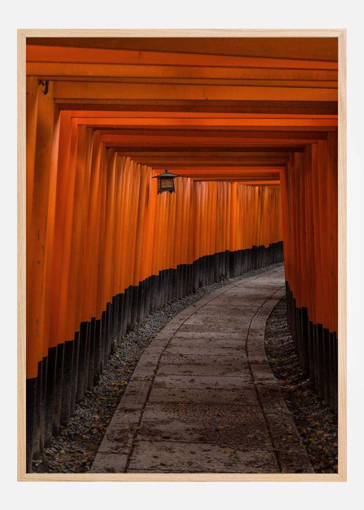 A portrait of a stone pathway lined with orange and black wooden beans. Hanging in the middle of the pathway is an iron lantern. The natural light shines onto the path where some small autumn leaves have fallen. A beautiful print to lighten up any wall.