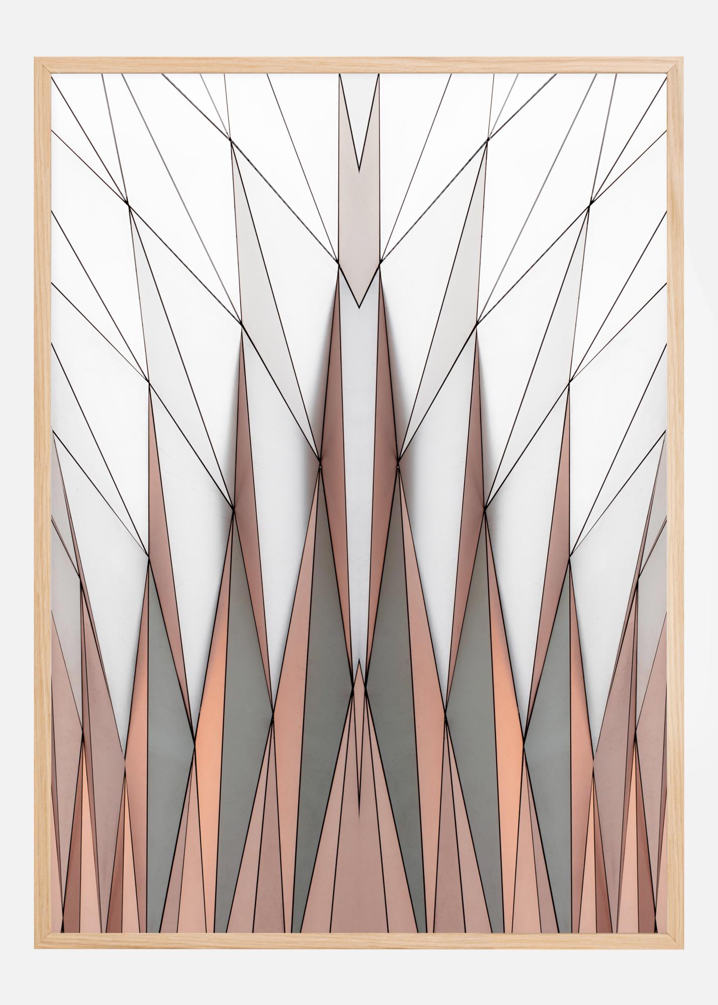 A beautiful print of triangles. The orange and grey coloured triangles are positioned at the bottom of the print pointing upwards. However, the remaining diamond shaped triangles cover the top half of the print. A great picture if you want to give the idea of space. Ideal for a living room wall.