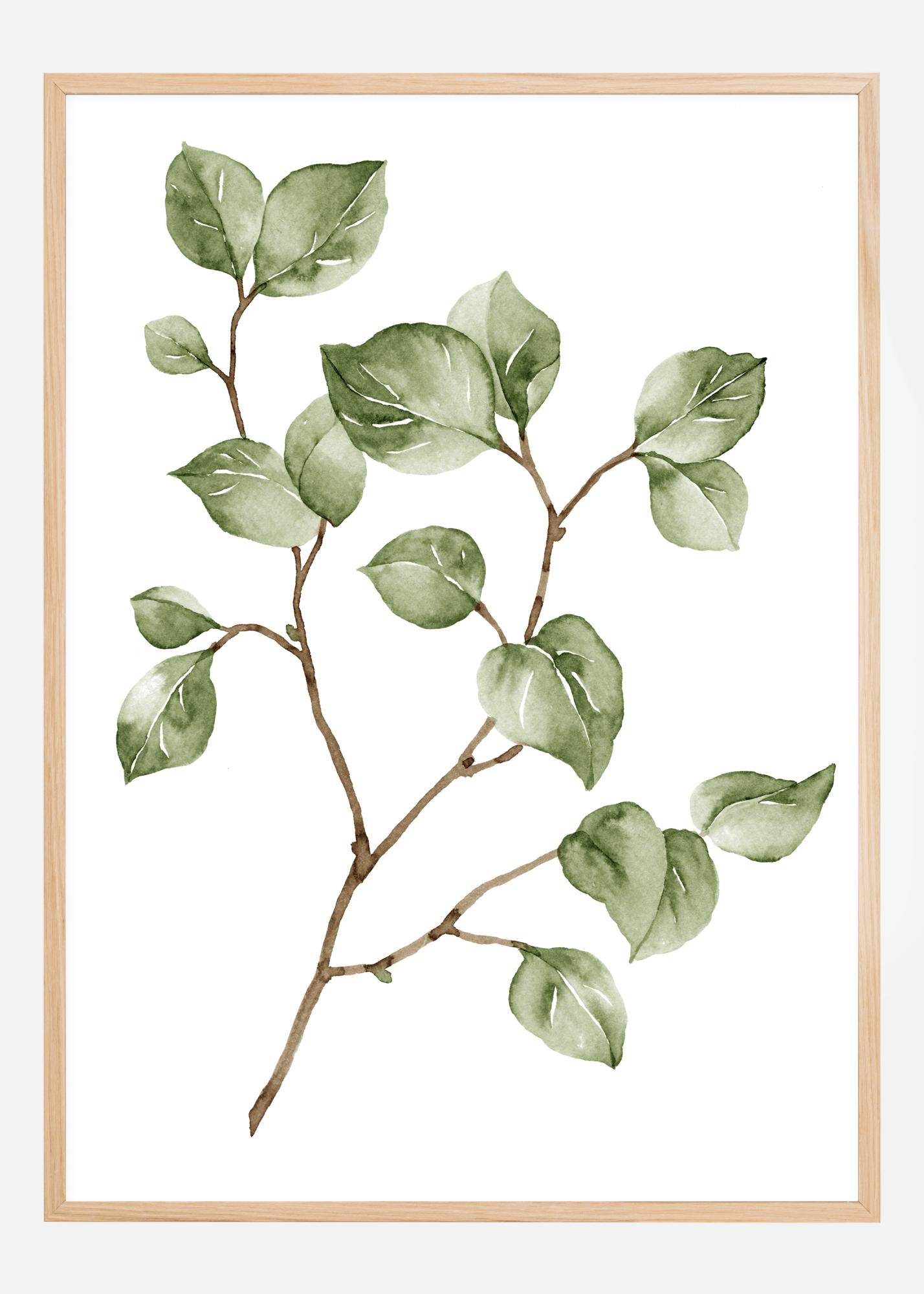 A beautiful painting of a thin brown branch with small green leaves. Painted on a white surface, the soft browns and greens enhance the delicate white veins of the leaves. A beautiful print to hang on a light green wall.