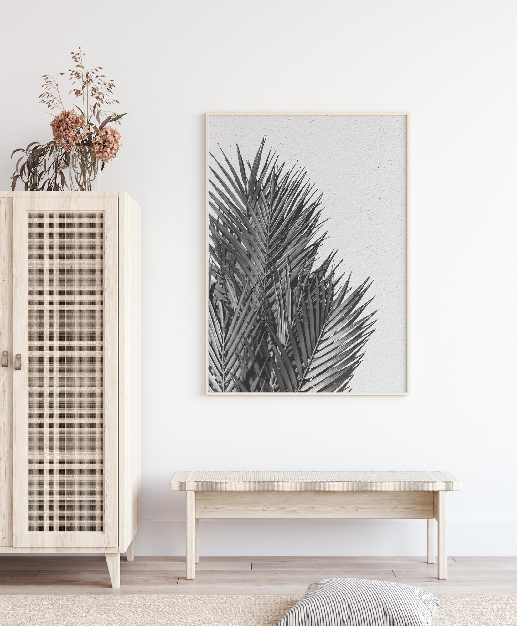 A black and white portrait of palm leaves leaning against a rough white wall. The rough wall enhances the palm leaves positioned one on top of another. Positioned to the left hand side of the print you can almost feel the heat beating down on the leaves. Add this print to your summer house for a tropical atmosphere.