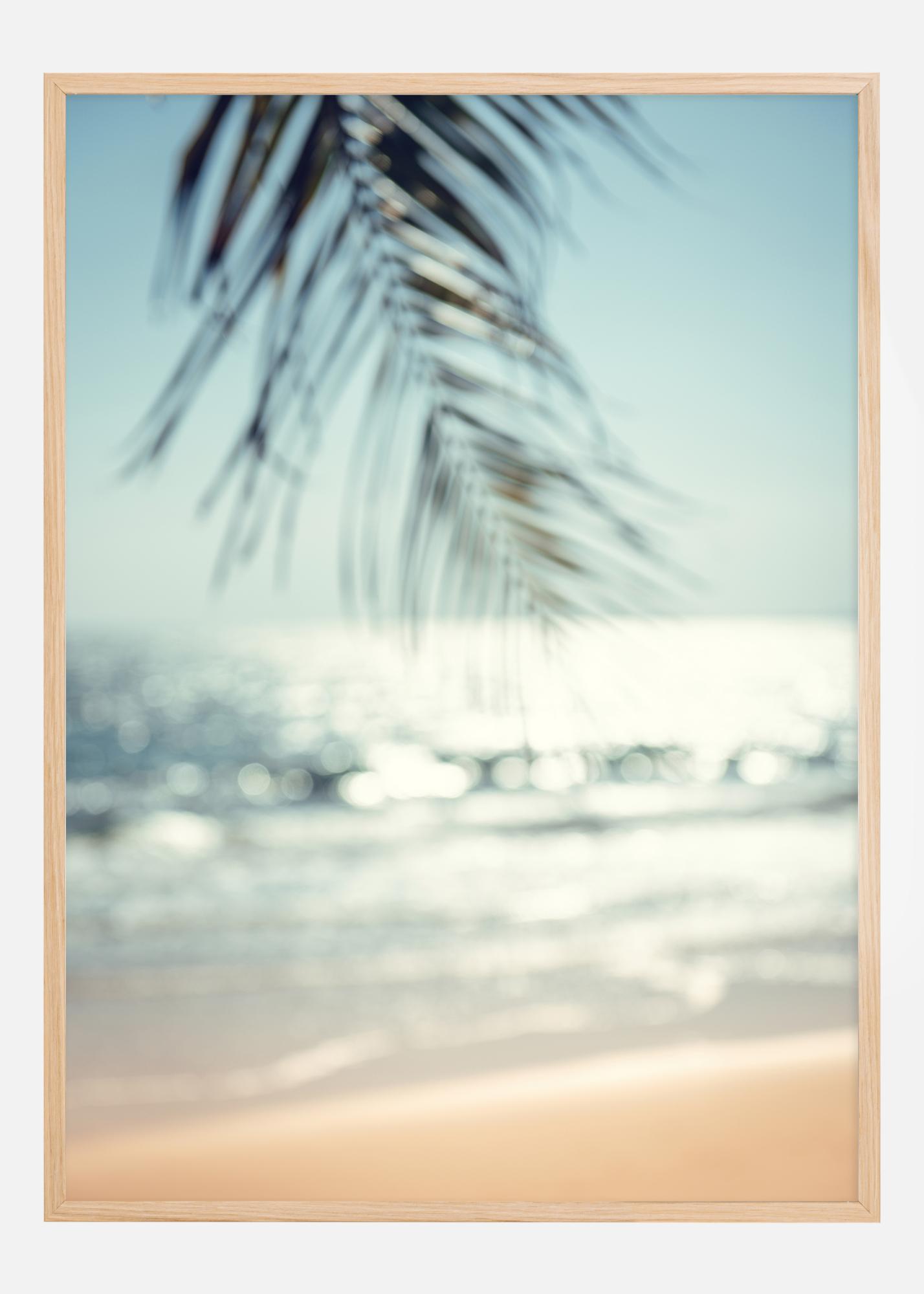 This poster is a dreamy escape to tropical latitudes and soothing landscapes. The motif focuses on a blurred palm branch sweeping across the image, with a shimmering sea and a golden beach in the background. The color palette exudes warmth and relaxation with its soft shades of blue, turquoise, and sand, which together create a sense of sunny days by the sea.