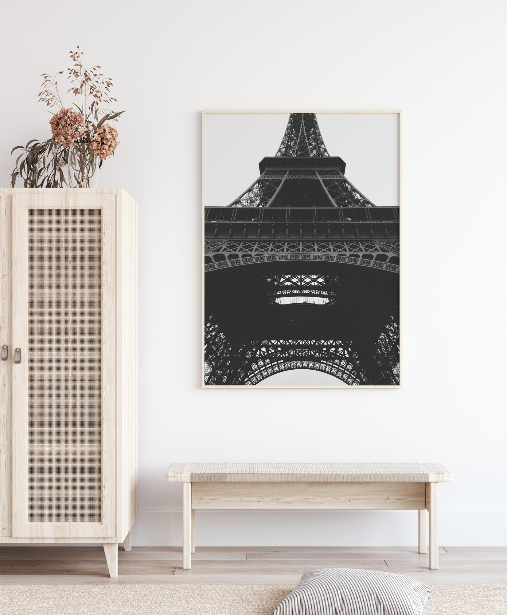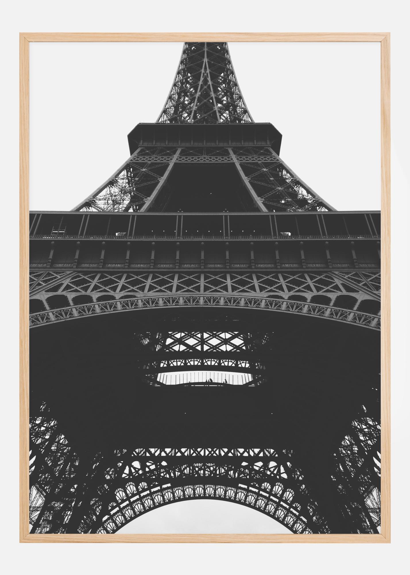 A stunning black and white poster of the Eiffel Tower. Taken from a bottom-up perspective, the solid puddled iron structure blends in perfectly with the grey sky. This technological masterpiece creates a light, airy but strong structure. A perfect print to hang in a modern environment.