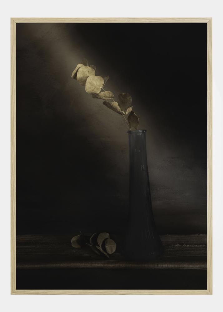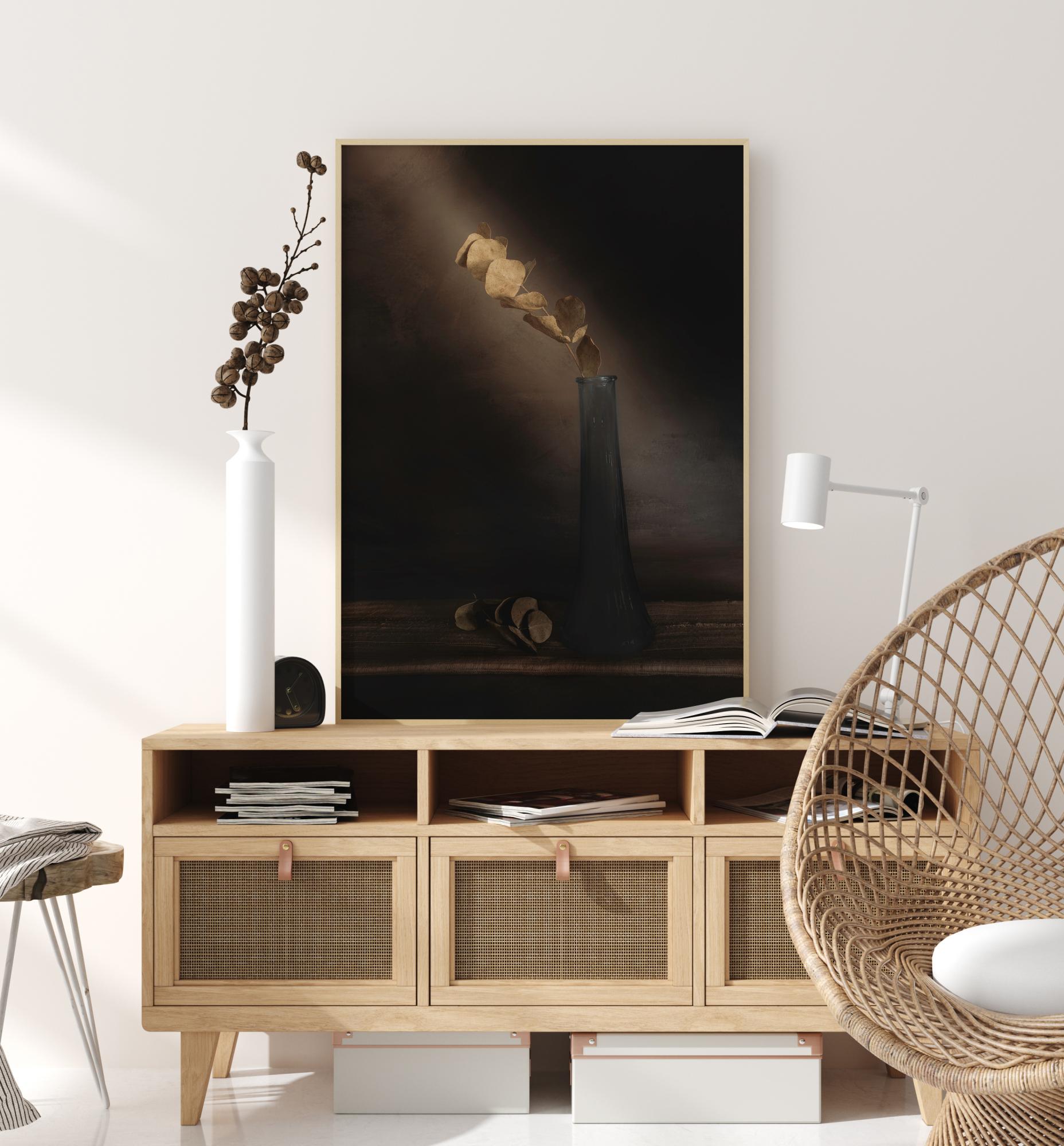 A simple yet beautiful print of a single stem of dried leaves in a glass vase. Set on a light brown background, the natural light shines directly on the dried grass. At the bottom of the print lies a collection of leaves that have fallen from the stem. A delightful print to hang in a peaceful environment.