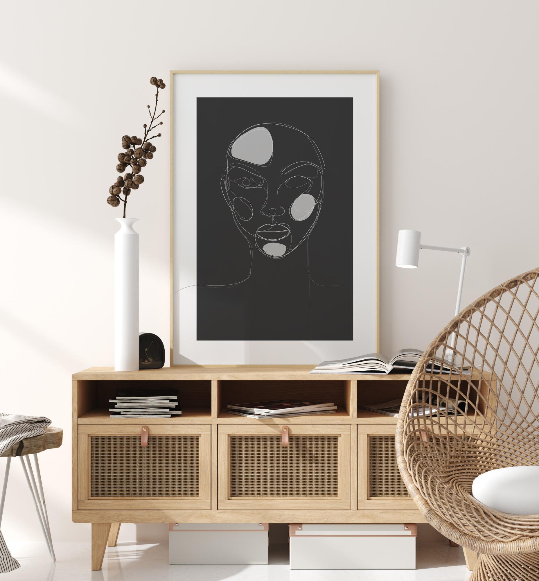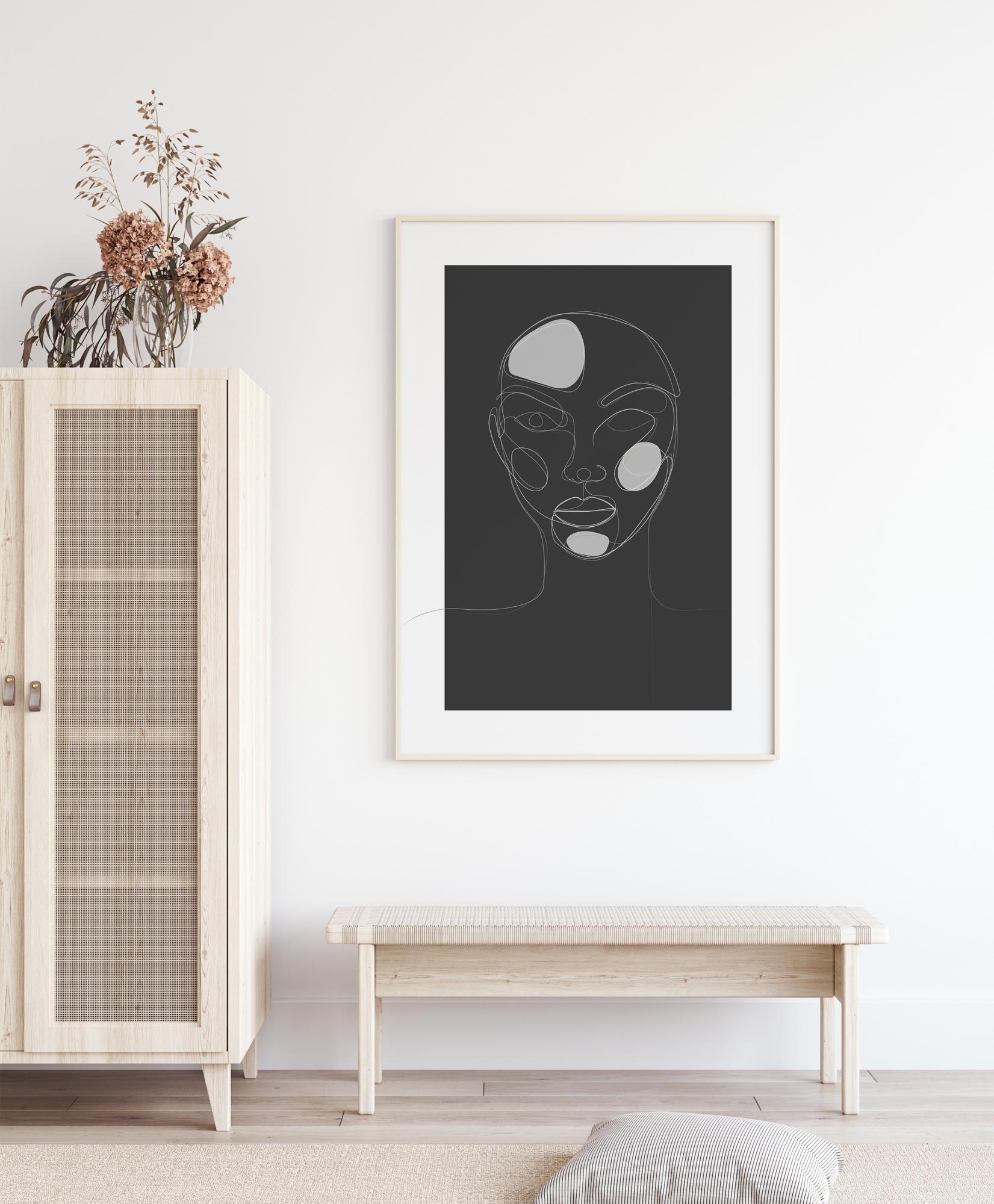 A stunning image of a woman's head and shoulder's drawn on a black background. Three white patches highlight the woman's forehead, cheek and chin. The print is a single line drawing with all features outlined in white. A powerful print to hang in your home.