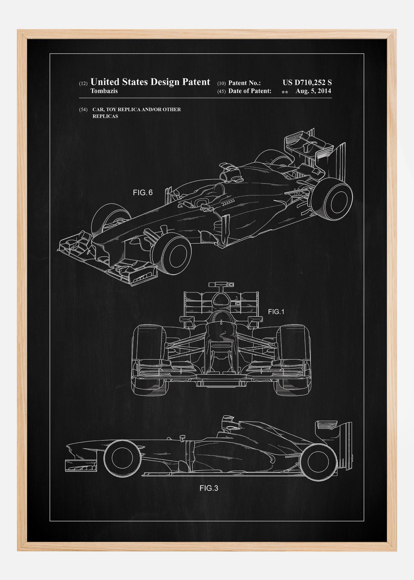 This patent poster highlights the elegant and complex design of a Formula 1 car, according to US Design Patent US D710,252 S, dated August 5, 2014. With its distinctive lines and aerodynamic shapes, the car's design is captured from multiple perspectives, providing a comprehensive view of its iconic and technically advanced character. This design is fundamental to the high performance and speed associated with formula racing.
