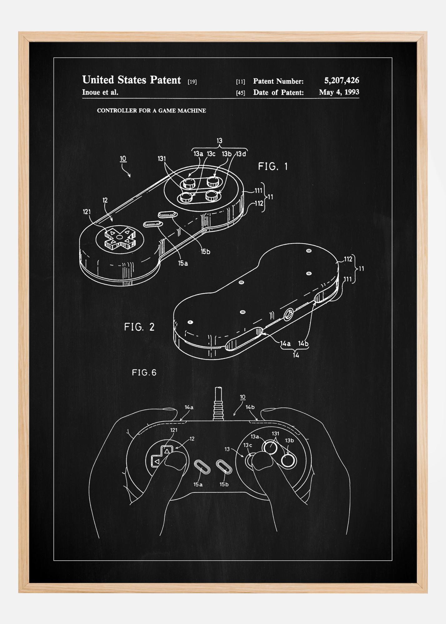 This patent poster highlights a classic design of a game controller for a Nintendo, patent number 5,207,426, dated May 4, 1993, against a stylish blackboard background. The patent drawing shows various views of the controller, including the top, bottom, and user perspective, which details the design of buttons and joysticks that have become central in players' interaction with digital game worlds.