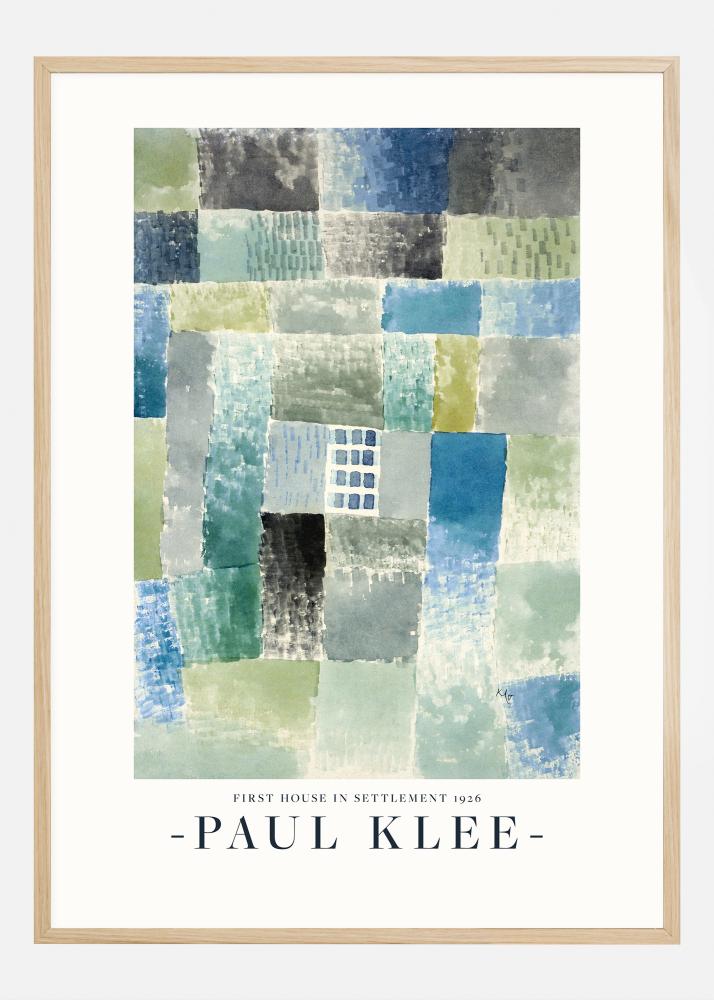 This vibrant poster of Paul Klee's "First House in a Settlement" from 1926 is a mosaic of color and form intertwined into an adorable city view. The multifaceted squares and rectangles create an abstract countryside in cool and warm tones of blue, green, and gray, evoking the feeling of a small town in peace. Klee plays with perspective, where some blocks appear to be in the foreground and others in the background, allowing the eye to wander through the artwork's shifting landscape.