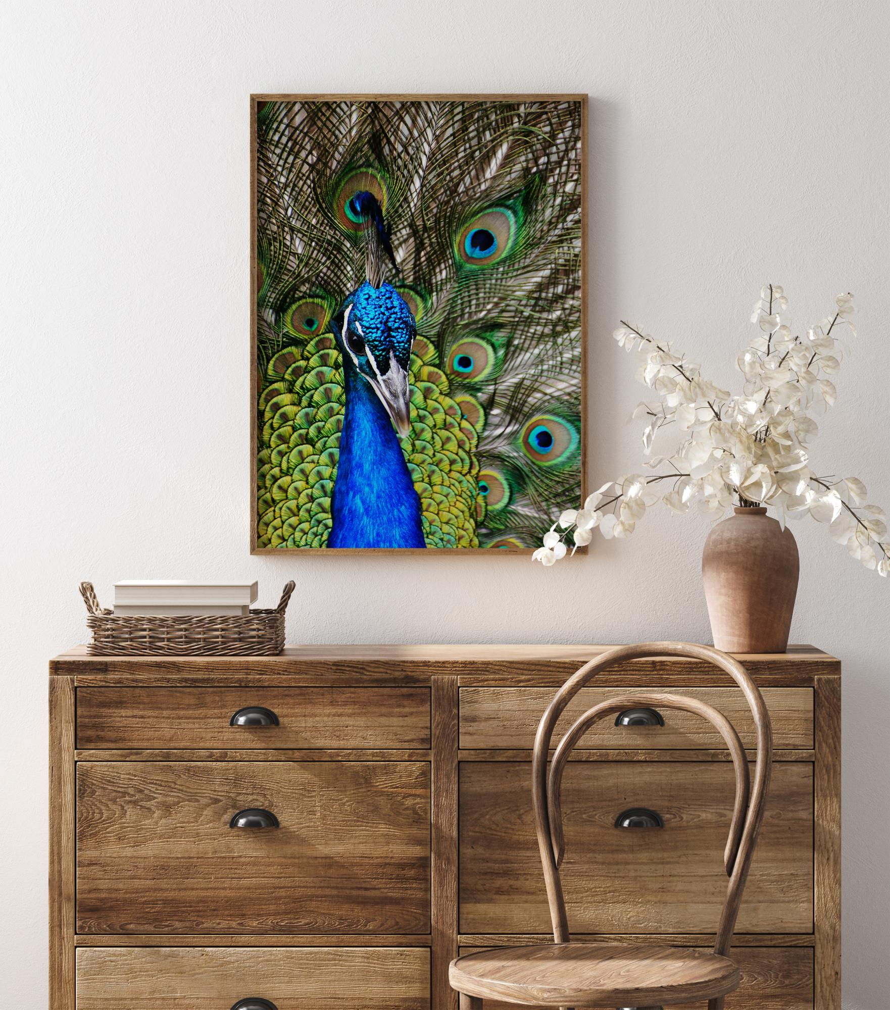 A stunning close-up print of a peacock. With his large colourful tail feathers with eye-like designs, this flamboyant creature shines in the natural sunlight. Bring the beauty of this bird into your home. A perfect print to brighten up any bare wall.
