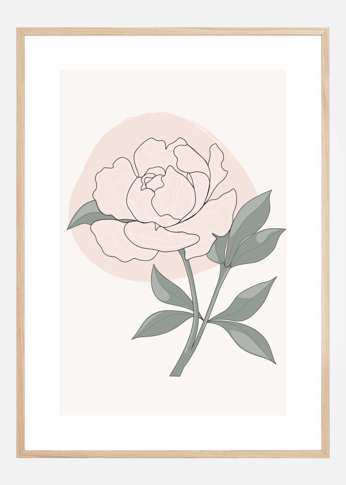 An artist's impression of a peony stem with a pink flower. Set on a beige coloured background, the pink flower is positioned on a peach coloured shape, while the leaves have been outlined in black. Bring the delicacy of this flower into your home.