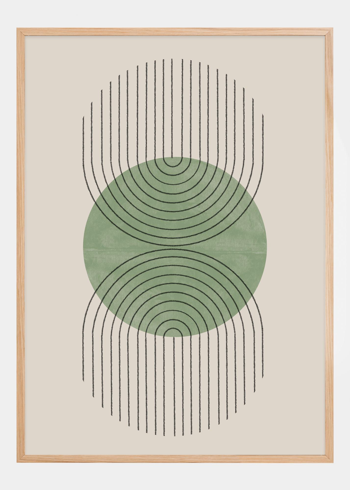 This poster is a minimalist artwork that highlights a saturated green circular shape surrounded by a series of black lines, giving a sense of space and depth. The green hue of the circle varies in intensity, creating a visual effect of dimension and texture. The lines extending outward from the circle's edge create an almost hypnotic effect and depict a geometric harmony.