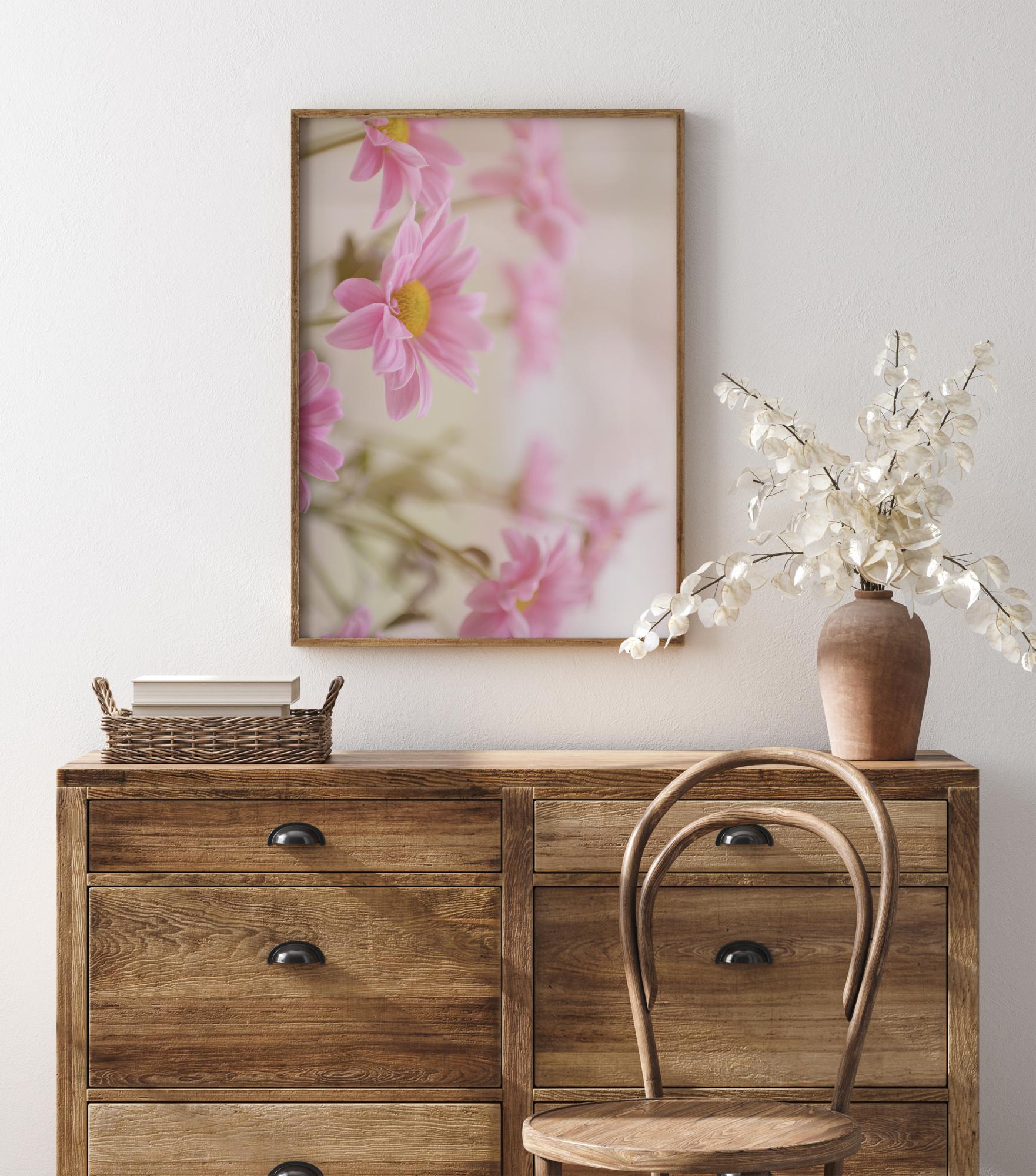 A close-up picture of beautiful pink daisies. Set on a beige coloured background, the beauty of these flowers creates a happy and peaceful atmosphere. With a bright yellow stamen, this is the ideal print to create a peaceful and loving atmosphere.