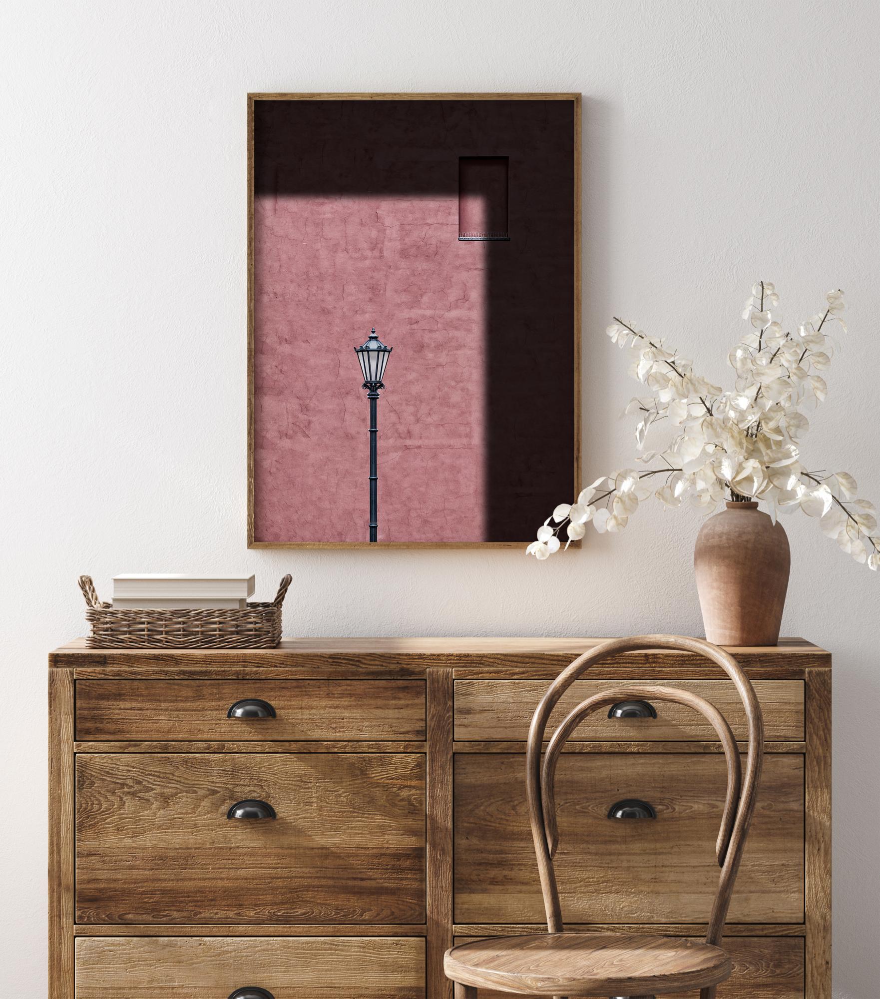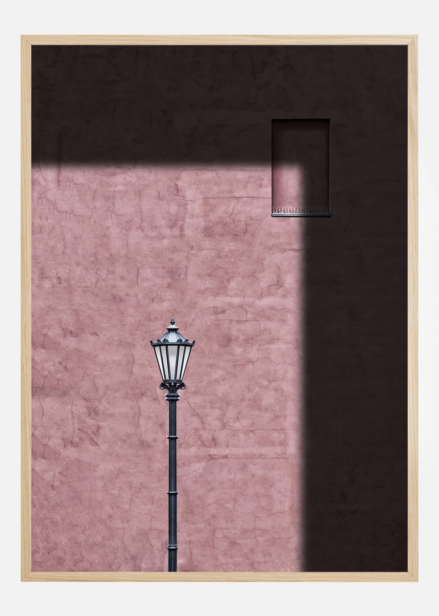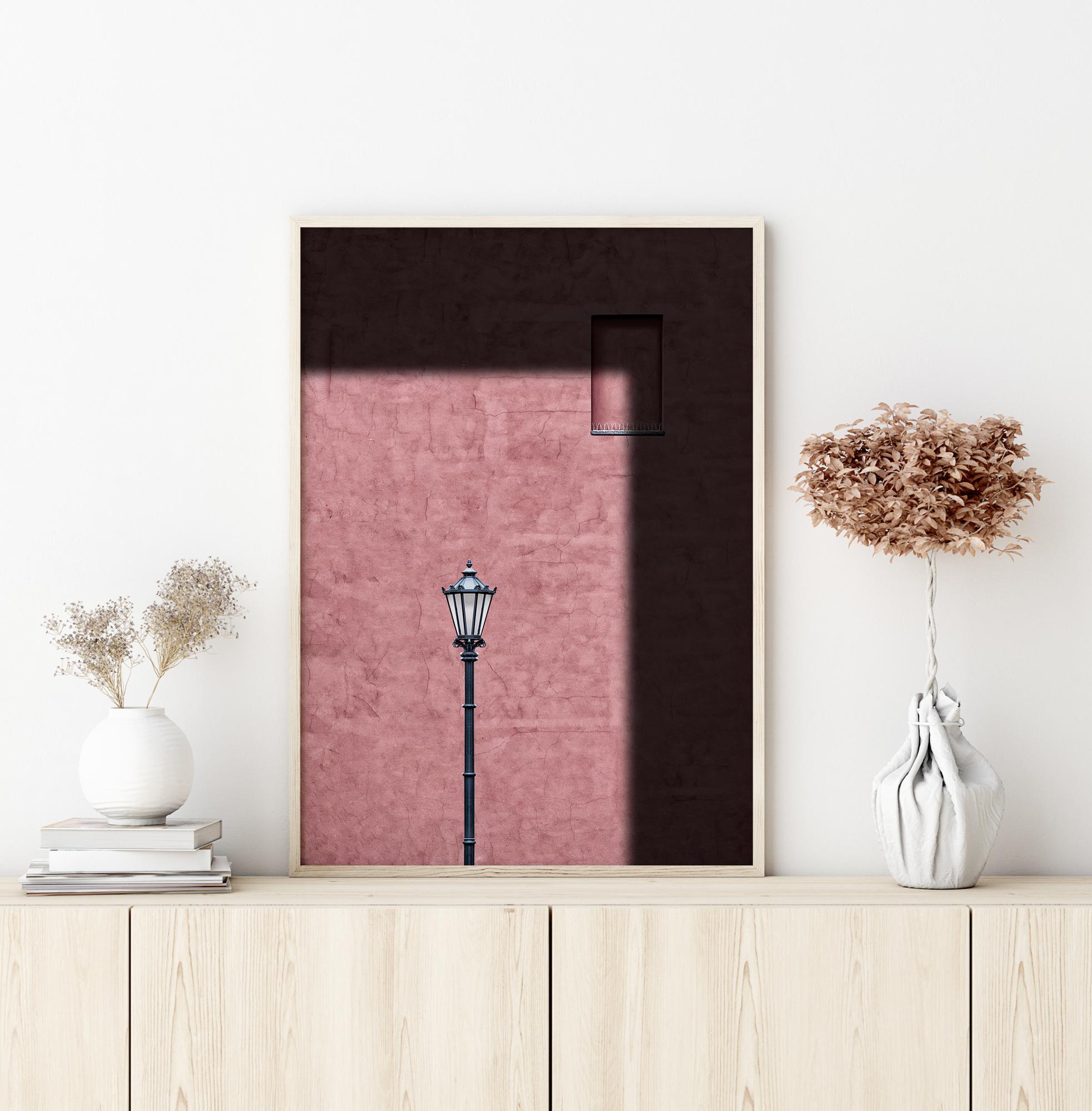 A colourful print of a pink facade with an outdoor lamp in the centre. The natural sunlight shines onto the wall leaving the upper part of the print in darkness. A small bricked in window can be seen in the upper right-hand corner. Bring some light into your home with this soft pink print.