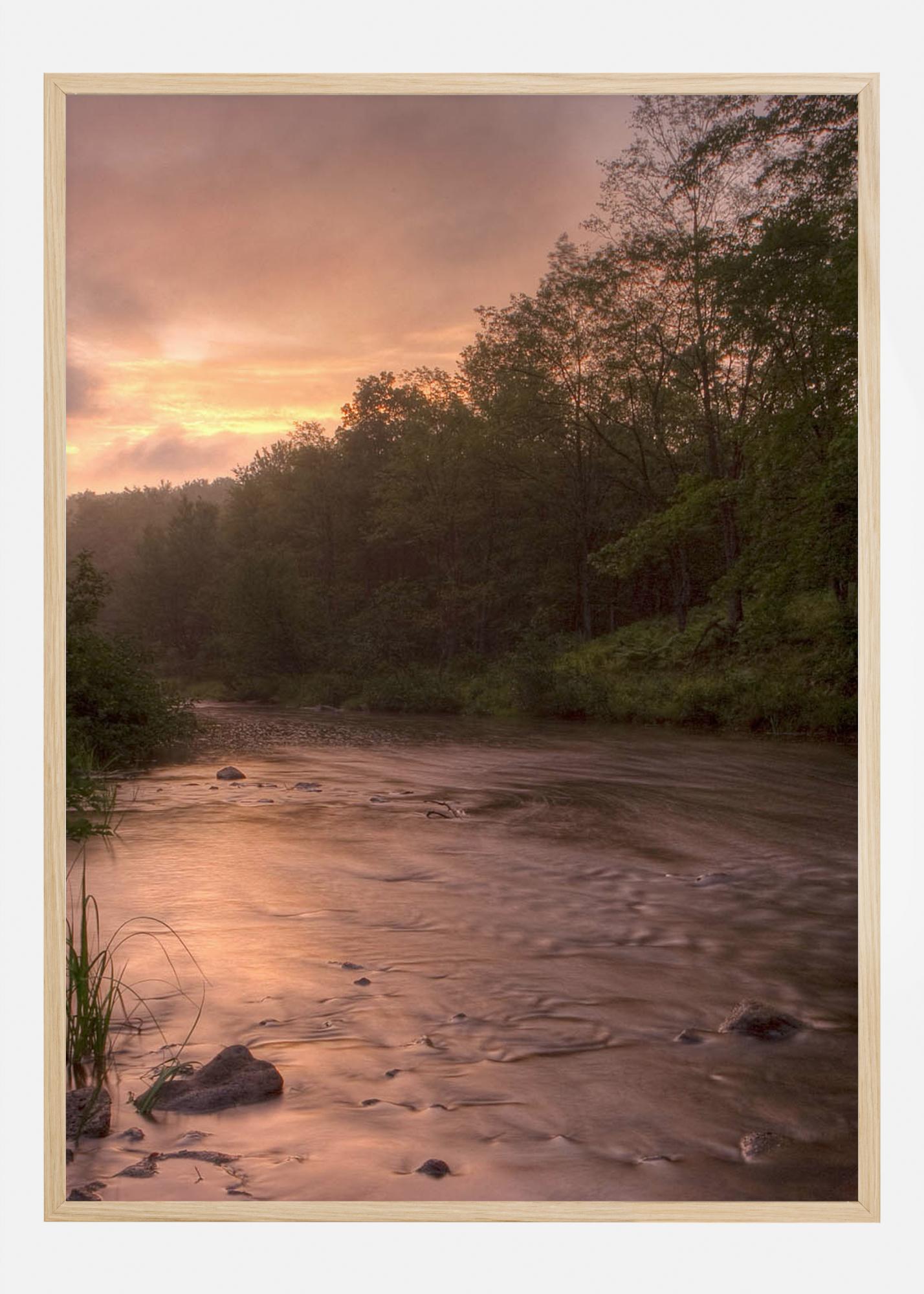 A stunning print of a muddy river flow aligned on both sides the woods. The evening orange orb makes its way through the clouds to add a subtle touch of orange to the scene. Hang this magical print in this living room and go with the flow.