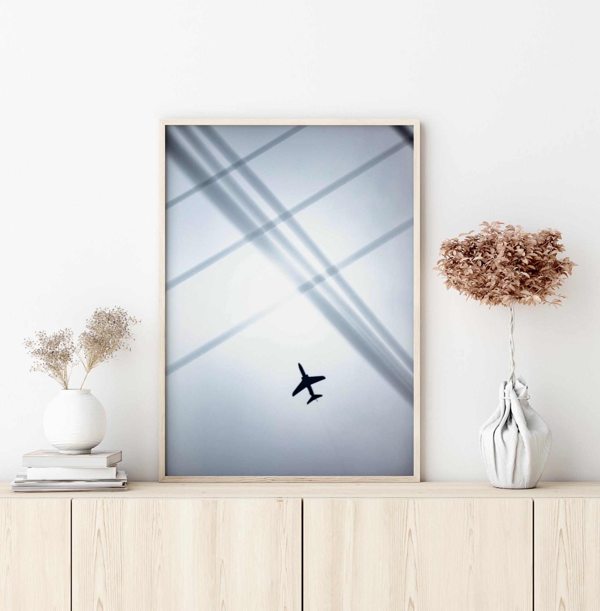 A bottom-up perspective of a plane flying overhead. The bright sunlight enhances the plane as it heads towards an unknown destination. The black parallel lines add a touch of colour to the print. Guess the final destination of this plane when you hang it in your home.