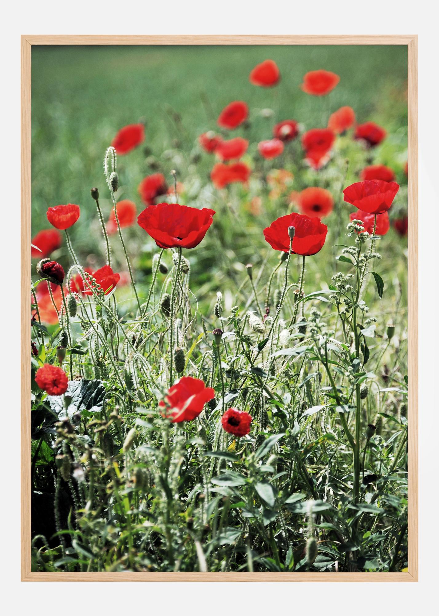 A beautiful close-up print of a poppy field. The dark green grass enhances the brightness of the poppies creating a fresh feeling. The poppies stand tall in the field while the grass grows widely. A relaxing and delightful print to hang in your bedroom.