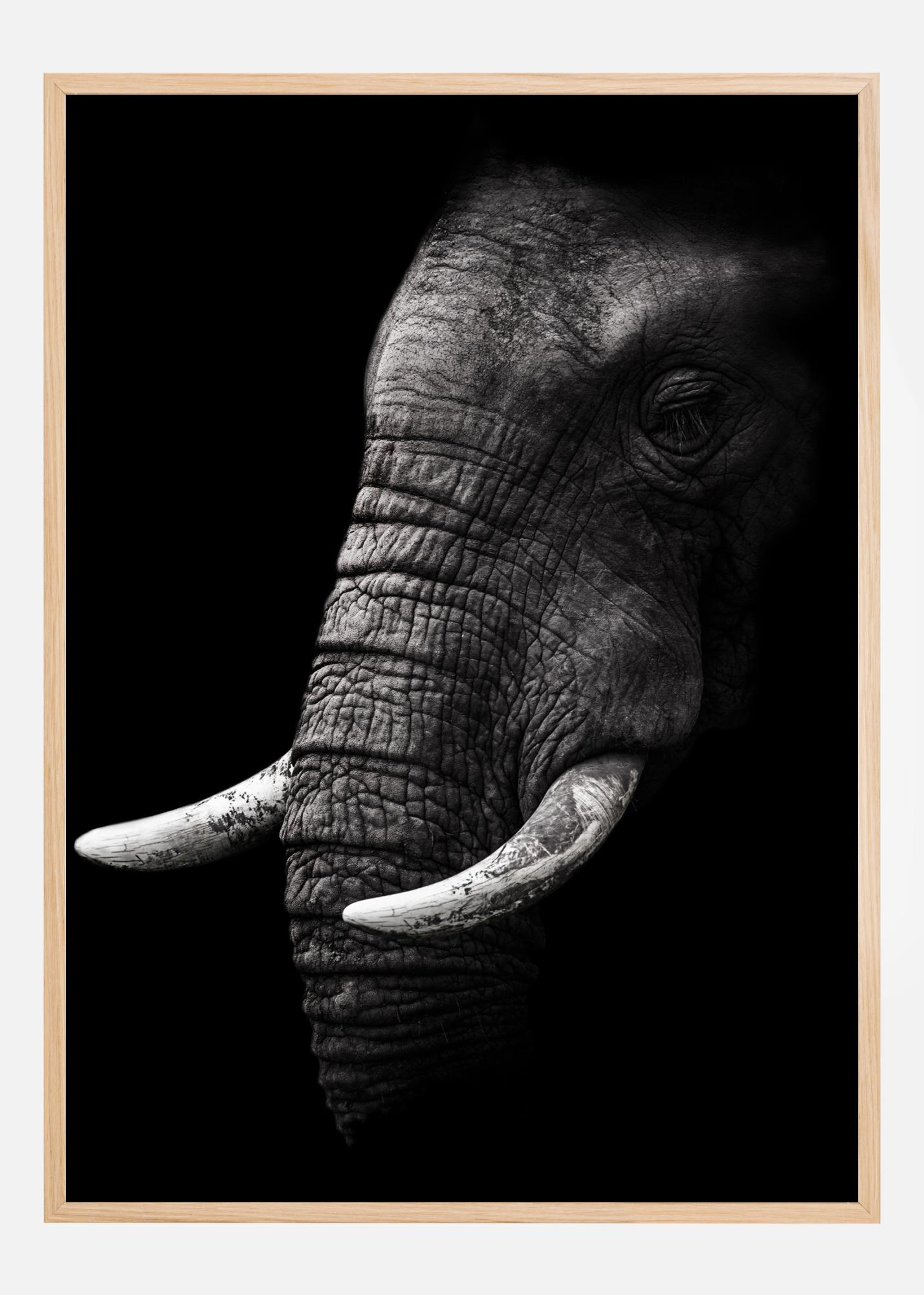 A stunning black and white print of an elephant's head. The black backdrop enhances the small elephant tusks. With its small wrinkled trunk and its eyes closed, the picture is a pure representation of elephant's beauty. An ideal print for animal lovers.