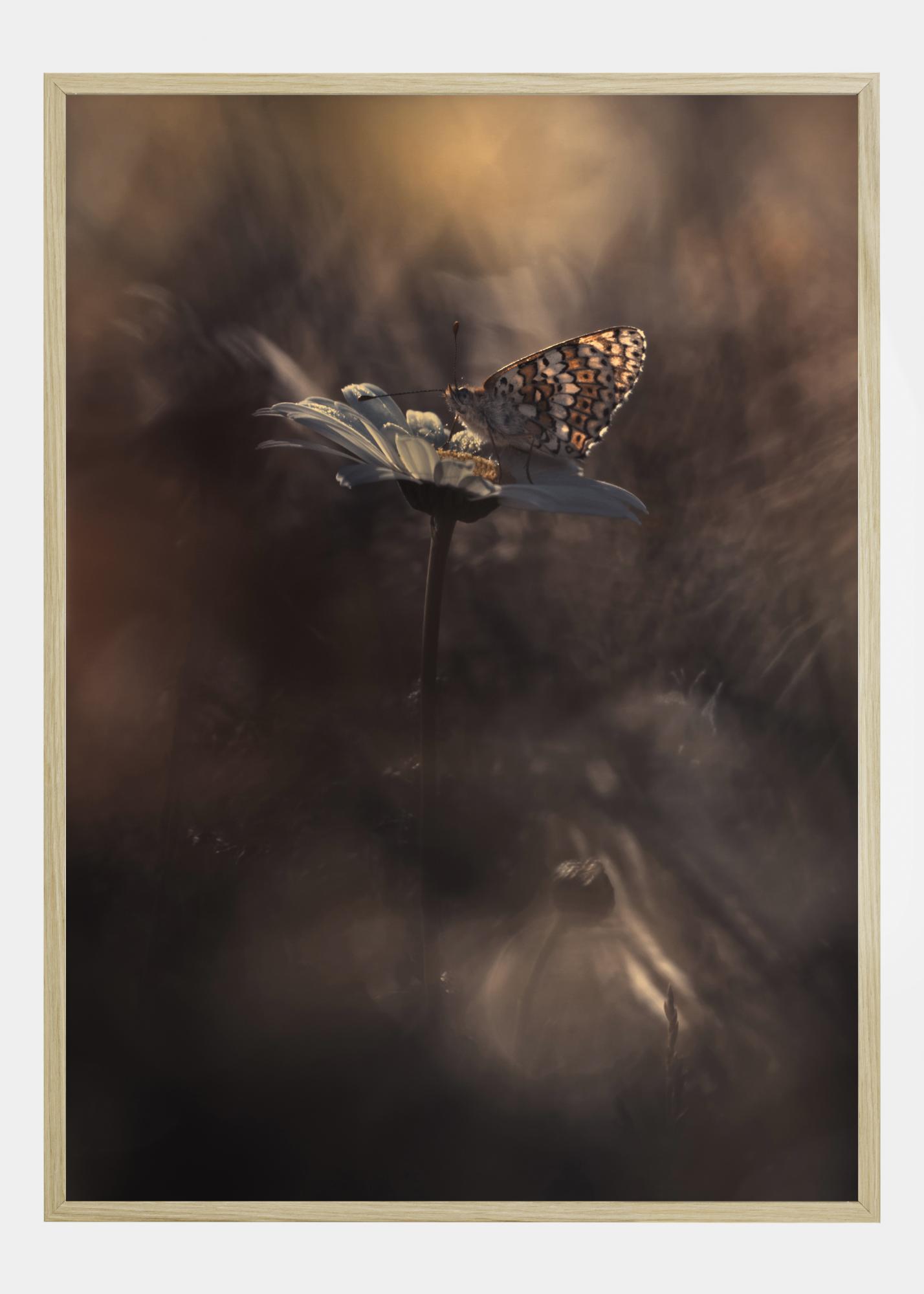 A flawless close-up print of an orange coloured butterfly perched on a single stemmed daisy. Set on a soft pastel coloured background, the blurred colours enhance the beauty and delicacy of the daisy and butterfly. A breath taking print to hang above a fireplace.
