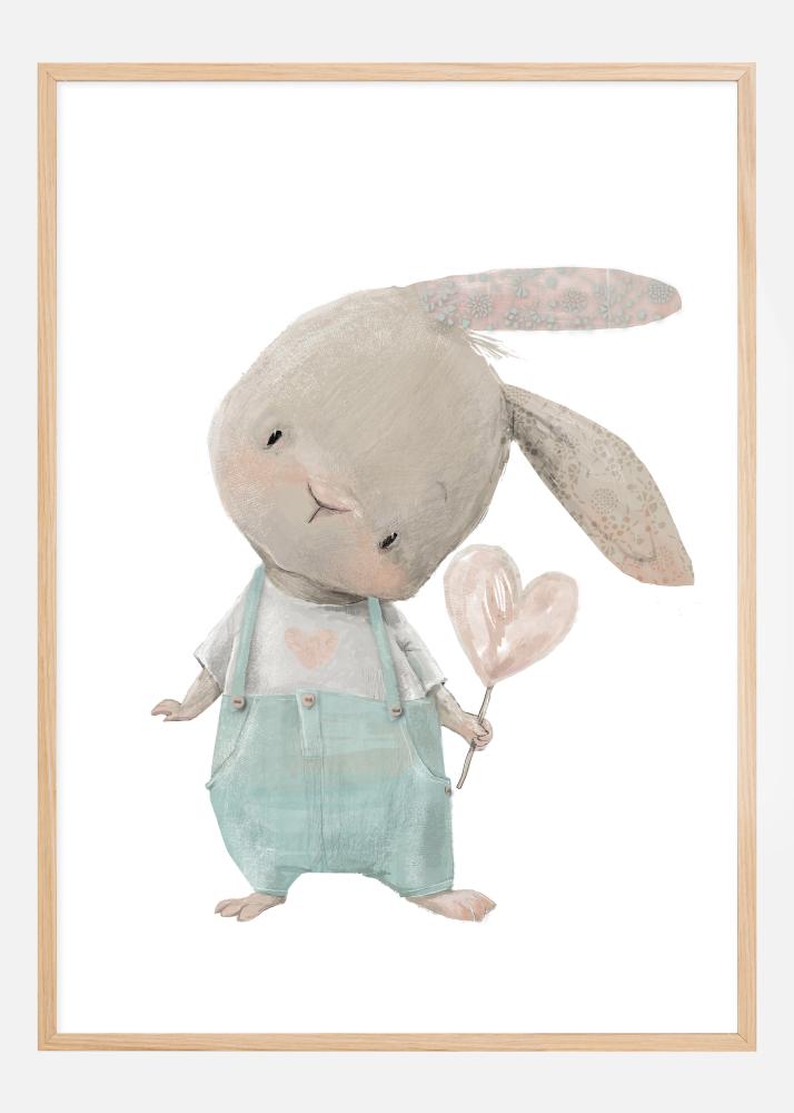 This adorable poster features a little rabbit holding a heart-shaped balloon, crafted with finesse and feeling through watercolor painting. The rabbit's gentle, dreamy gaze and the fine detailed work in its clothes, which includes pastel-colored floral patterns, give a sense of innocence and purity. This illustration is a delightful tribute to love and care, evoked by the heart-shaped balloon.