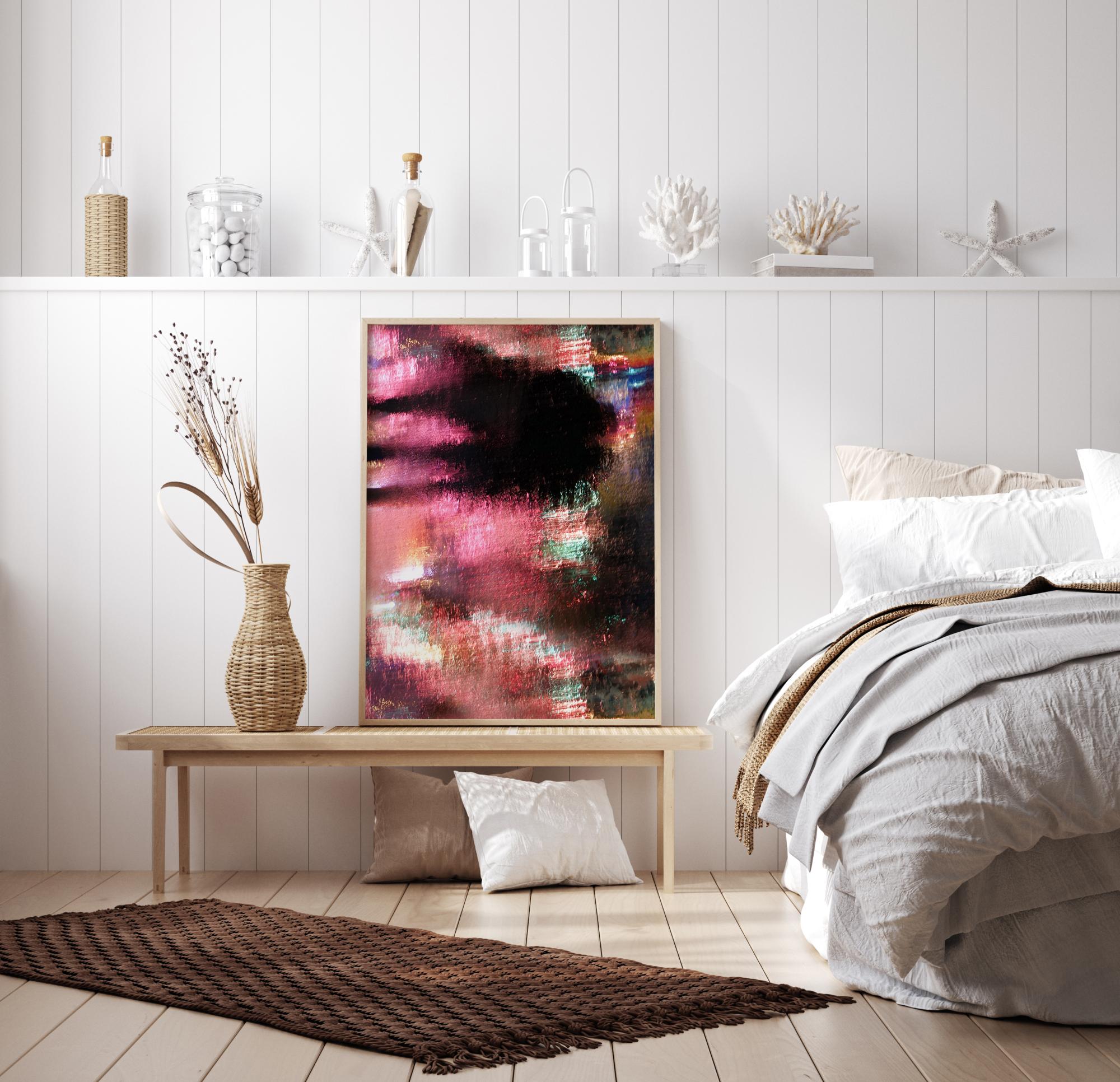 A perfect blend of colours with pink tones dominates this multi-coloured print. To the top of the print a black area creates a feeling of deepness. To the right of the black area there is a vertical tube liked shape of reds and greens. A perfect print to add a touch of colour to a plain wall.
