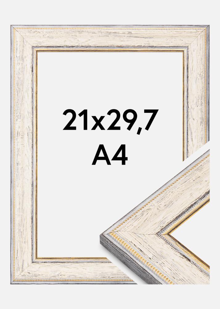 This beautiful photo frame in size 21x29.7 cm (A4) is a perfect combination of vintage-inspired design and modern functionality. With its rustic white and gray wood finish, complemented by subtle gold details along the inner edge, this frame offers a charming aged look. The profiled design and clear wood texture make it an excellent choice for rural, shabby chic, or classic interior styles.