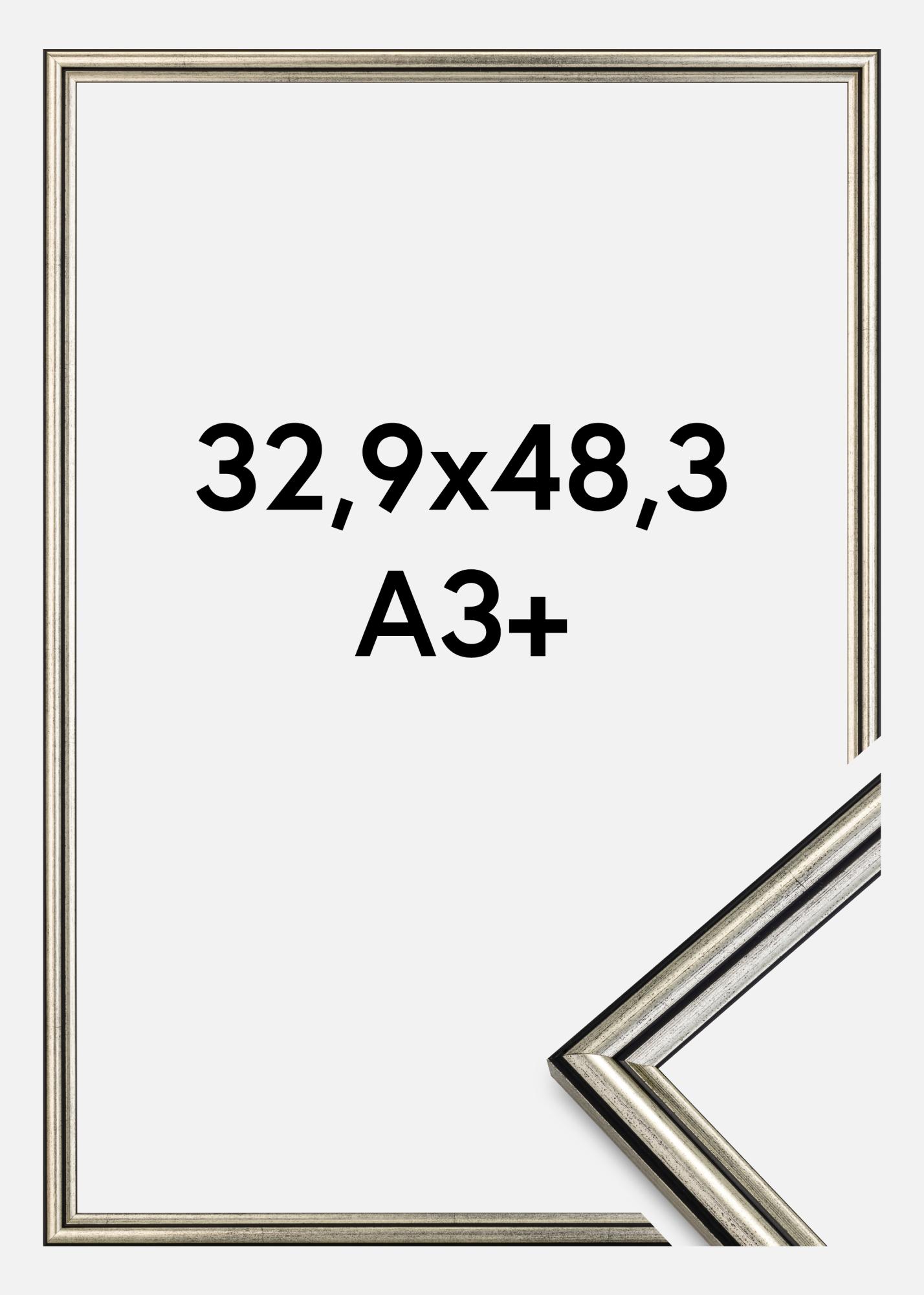 Discover the elegant silver frame with dimensions 32.9x48.3 cm (A3+), a perfect combination of style and function for your favorite photos or artworks. This photo frame is specially designed to create a sophisticated impression with its speckled black details and black lines that discreetly highlight the frame's design.