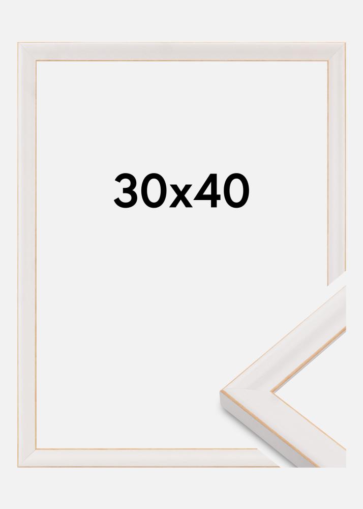 This elegant photo frame in a soft, creamy white shade with a thin gold edge is a perfect combination of style and functionality. With a frame strip that is 20 mm wide and a depth of 16 mm, this picture frame offers a stable and robust framing for your favorite images. The frame is made of wood and has a slightly curved profile that gives it a sophisticated and timeless design. The subtle gold detail along the inner edge provides an exclusive feel and frames your artwork or photographs in an elegant manner.