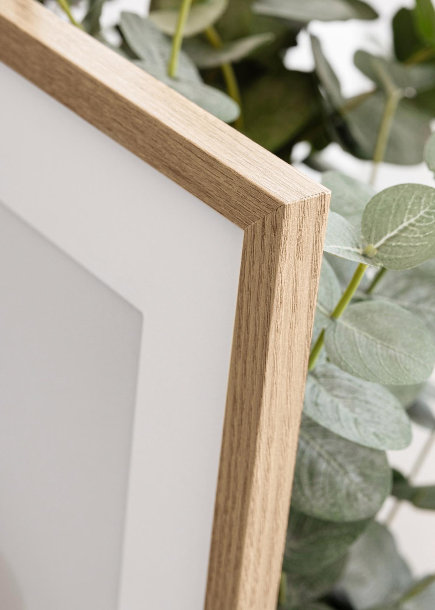 The frame is made from MDF material wrapped with an oak style finish and has a slender frame profile of 14 mm. There is plenty of room to complement your images with an elegant passepartout or mount as the frame has an inner depth (rabbet) of 12 mm.