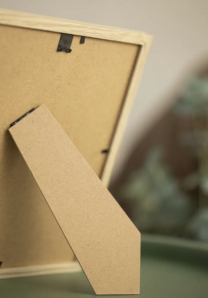 The frame is made of MDF material with a foil-coated oak-coloured surface and has a thin frame profile of 14 mm. There's plenty of space to complement your pictures with a luxurious passepartout, thanks to the frame's inner depth (rabbet depth) of 12 mm.
