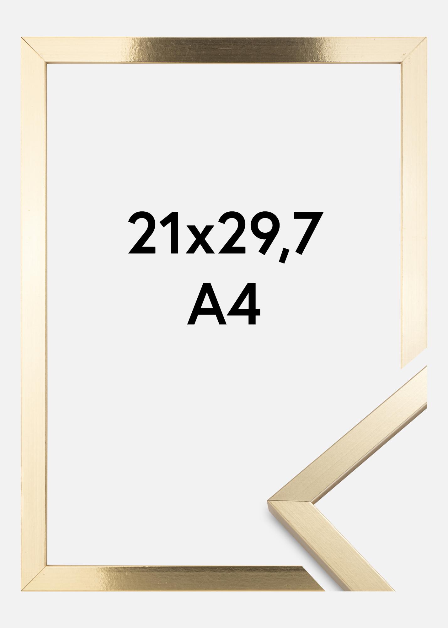 Create an elegant photo wall with our stylish gold frame, perfect for showcasing your favorite artworks or photographs. This picture frame in the size of 21x29,7 cm (A4) is a sophisticated detail that adds a luxurious touch to any room. With its shiny gold finish and glossy surface, it becomes an instant eye-catcher on your wall.
