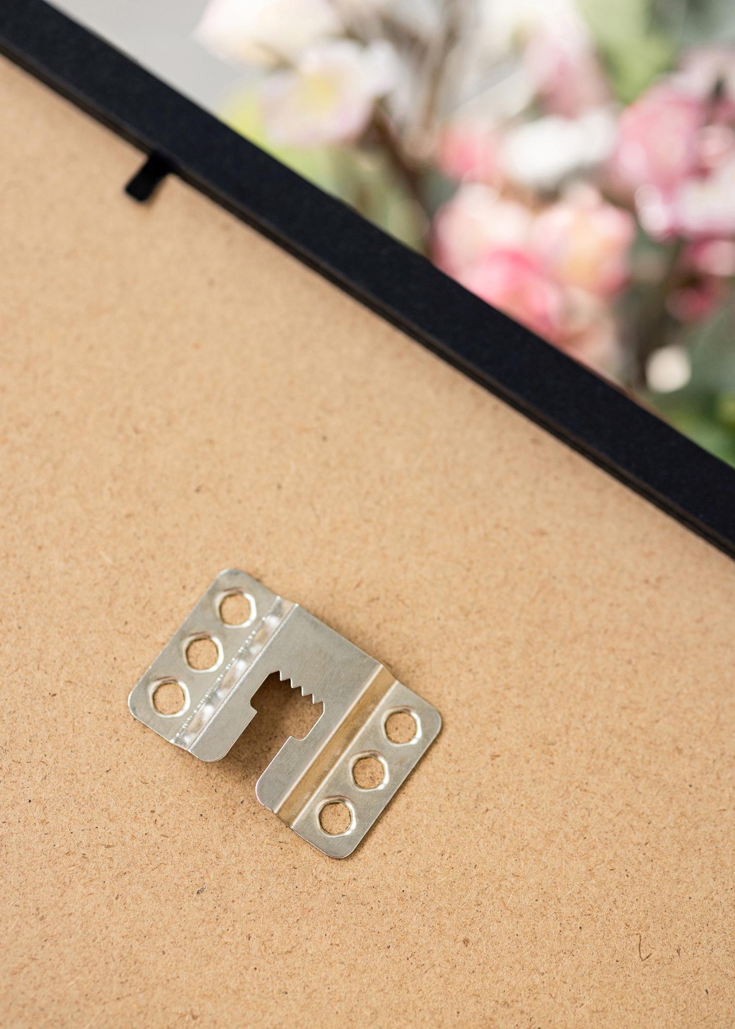 The frame is equipped with metal hangers on the back, making it easy to hang both horizontally and vertically. This gives you flexibility to customize the presentation according to your space and preferences. The frame's depth is 15 mm, which contributes to its elegant and sophisticated appearance.