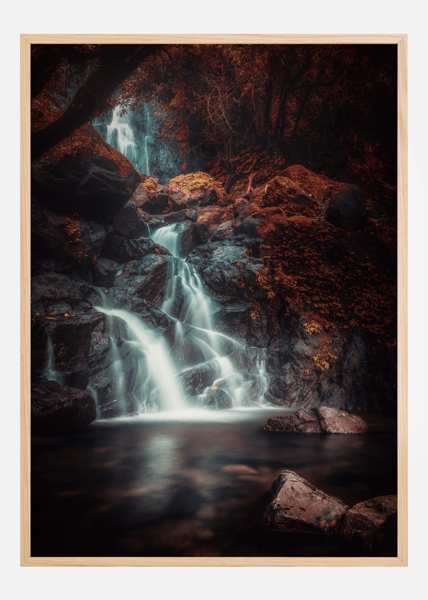 A fantasy poster of a magical waterfall amongst red moss and red trees. The dark nature of this image helps to create a magical ambience with the focal point being the bright white waterfall. Travel to your own garden of Eden in this image.