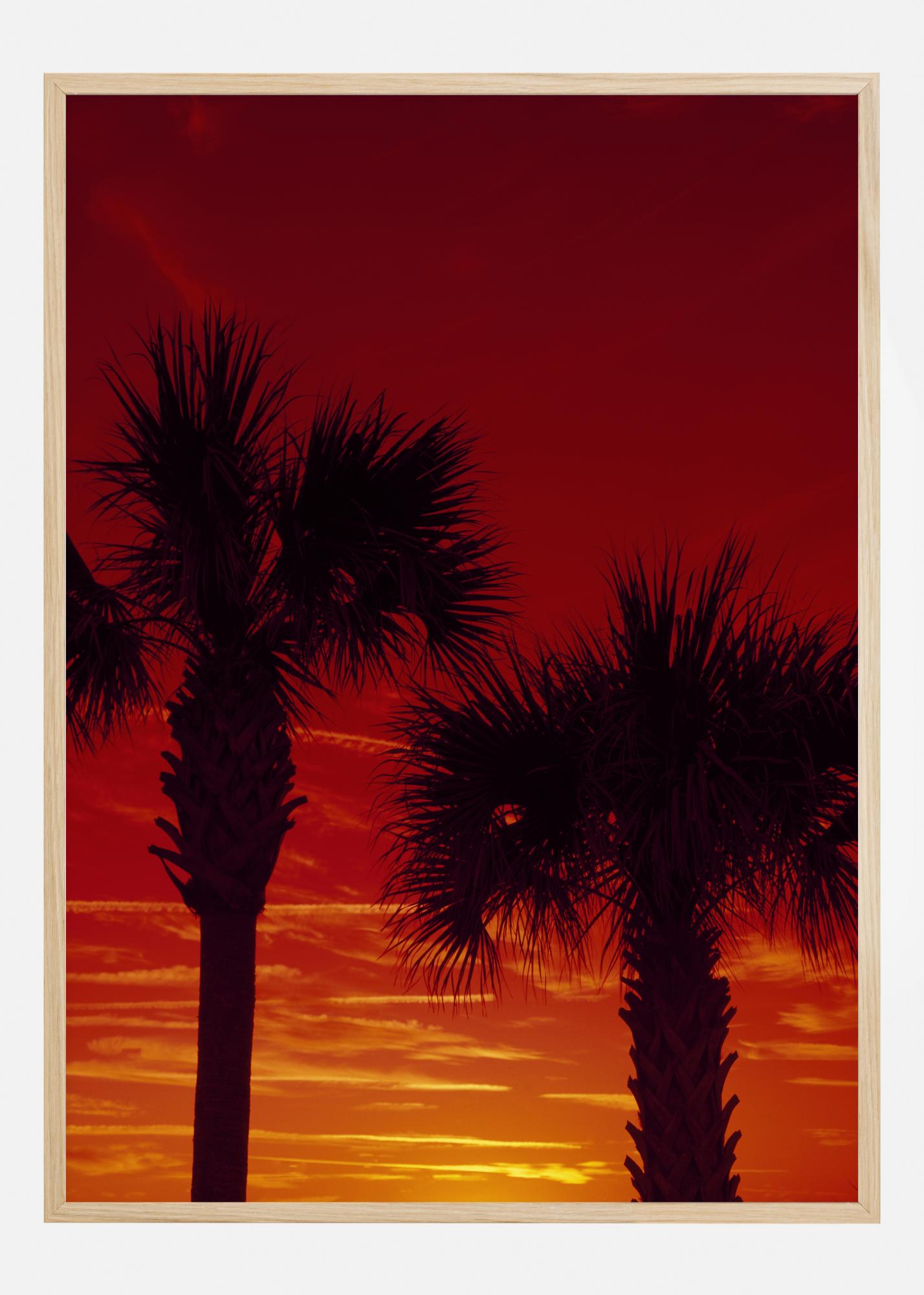A foreboding poster of two silhouetted palm trees against a deep red sky. The sunset is yellow at the bottom turning a dark red as it passes the tops of the palms. This creates a dramatic look that will have your heart racing when you pair this with a plain wall.