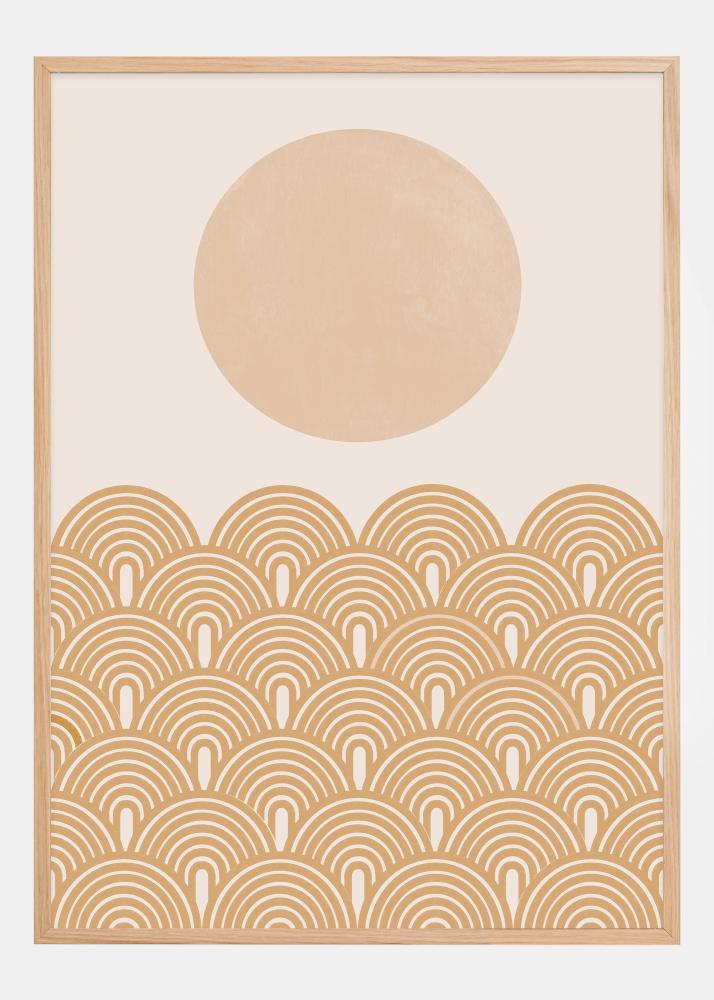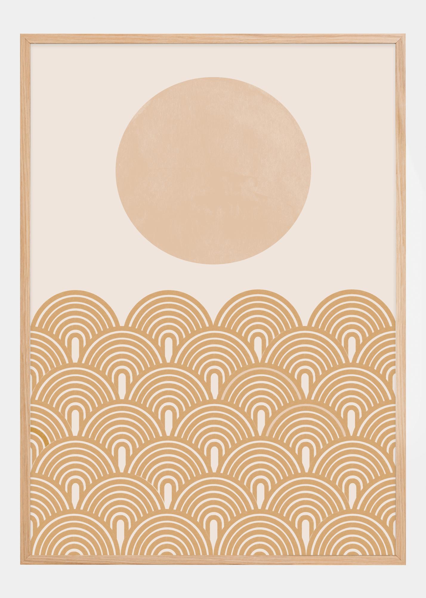 This poster is a sunny interpretation of retro styles and summer vibes, where a large pale pink circle hovers above a pattern of arched elements in a warm terracotta tone. The arches are interconnected in a way reminiscent of waves or hills, providing a sense of movement and vibrancy. The soft color scheme contributes to a feeling of warmth and calm.