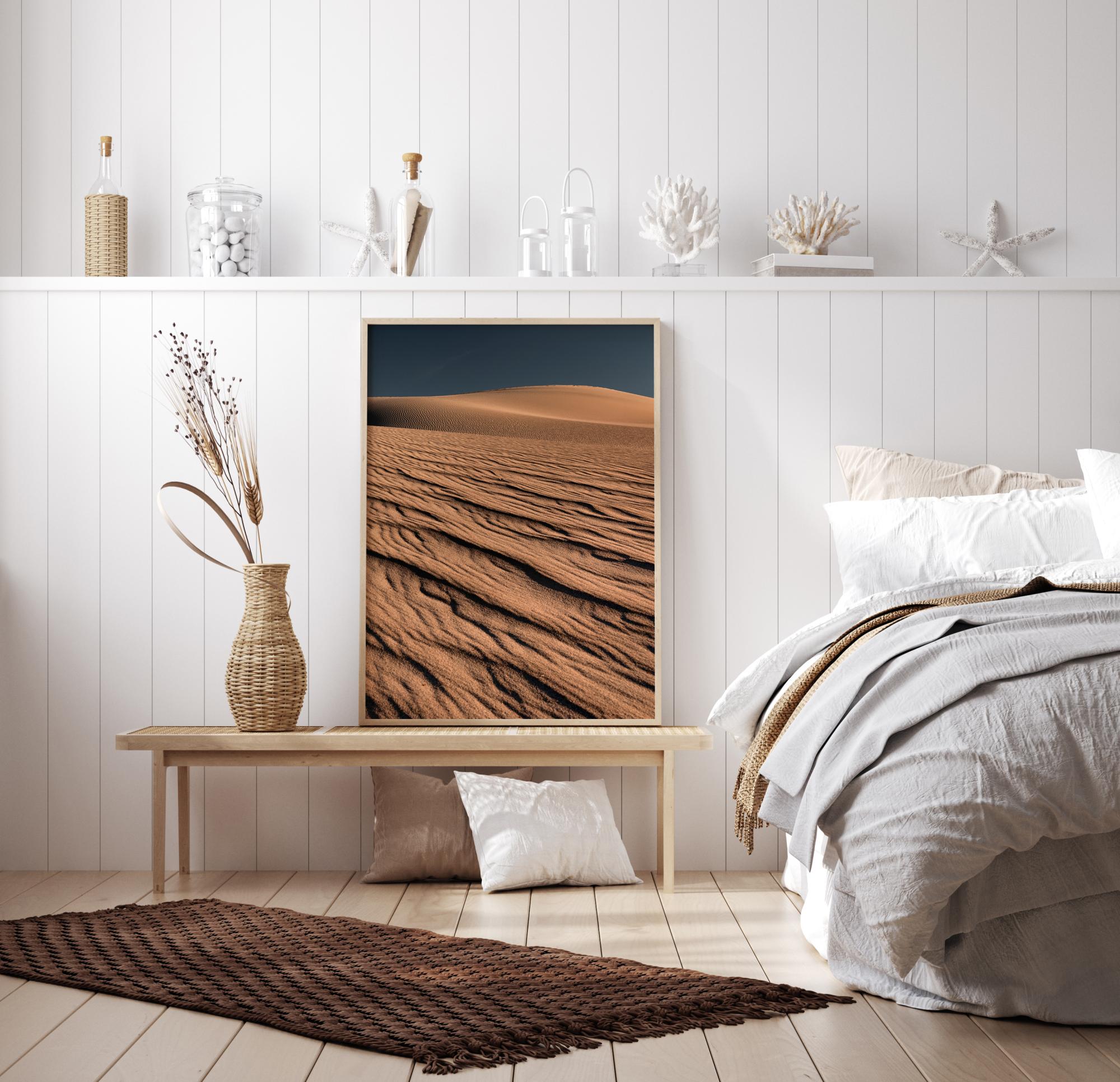 A dramatic poster of waves of sand on the dunes. This stunning shot creates harmony with the contrasting yellow sand and blue sky. Take home some drama as the eye is drawn through this print.