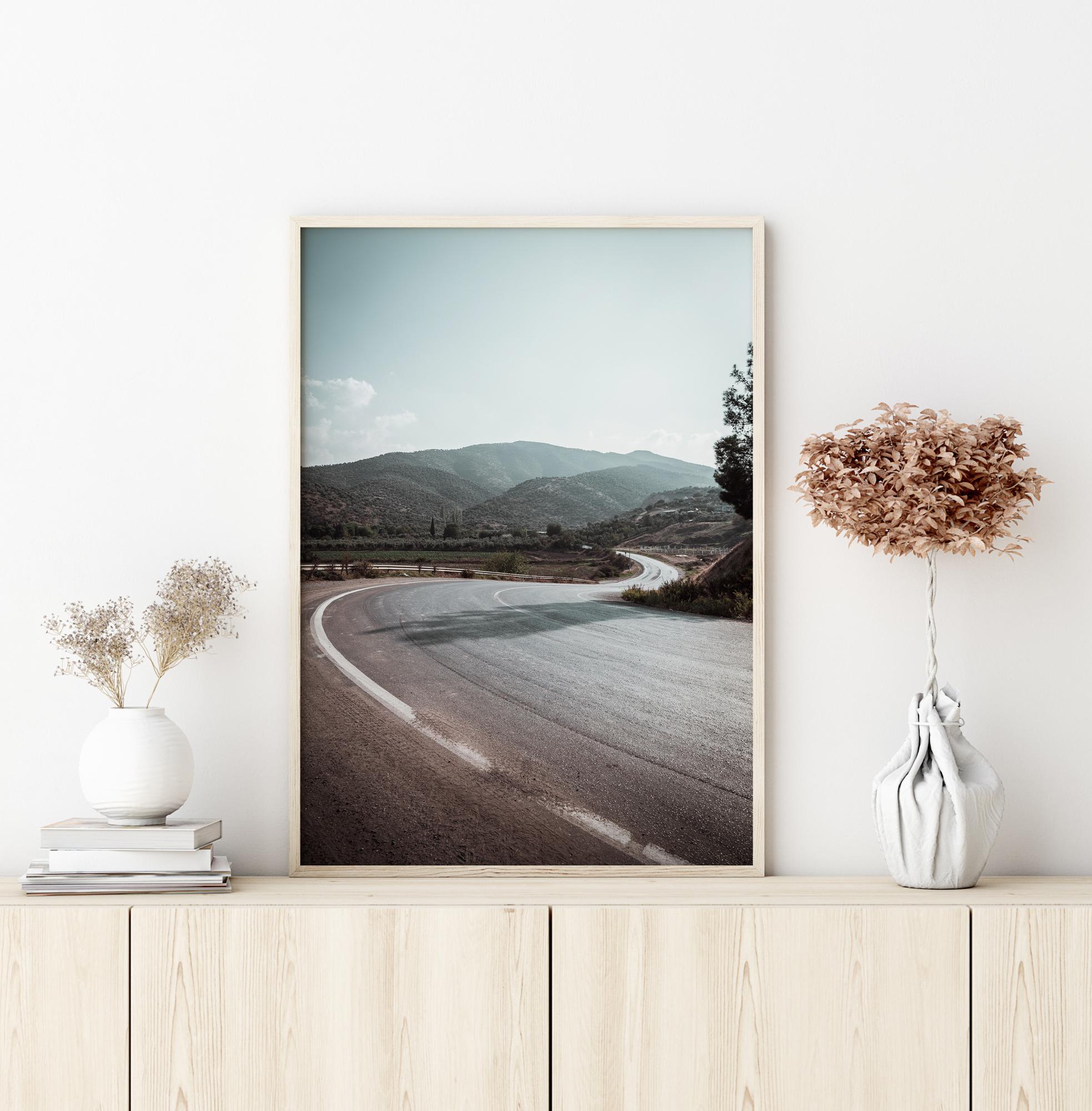 A scenic poster of a road curving through the mountains. A single tarmac road winds its way into the distance to the far-off mountain tops. The colours are soft, reminiscent of a spring day driving with the top down. Get that easy breezy feeling with this poster.