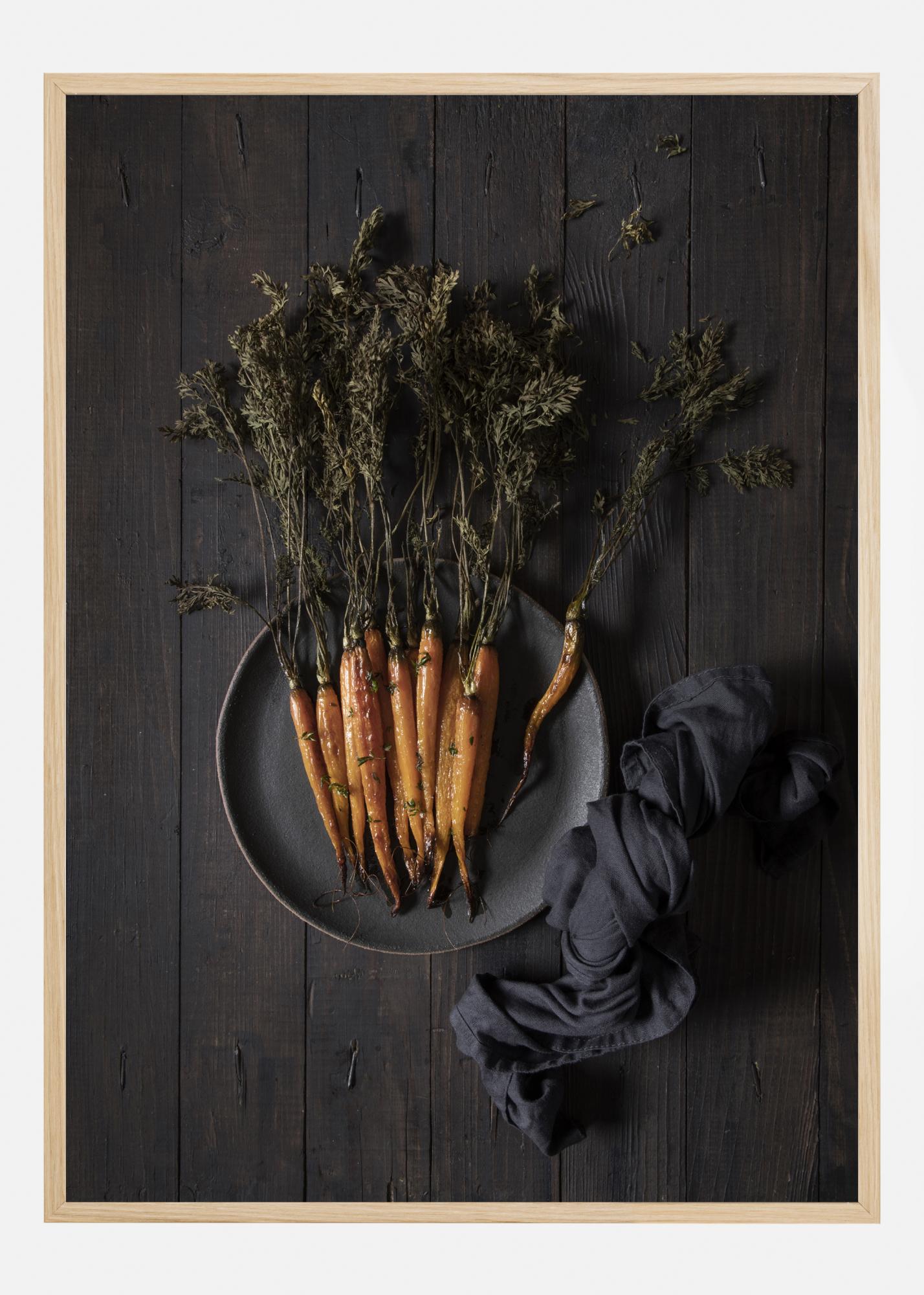 A culinary poster of a bunch of freshly pulled carrots lying on a dark blue plate. The orange carrots fairly glow as they sit on the navy plate with the dark wood behind. The wilting leaves indicate these carrots are ready to be eaten. Add this to your kitchen for a fun foodie vibe.