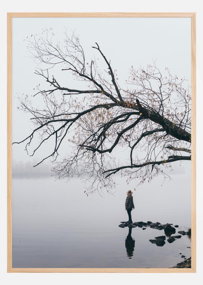 A lakeside view poster of a woman standing on a small stone causeway in a lake as a tree bends overhead. The white lake matches the same coloured sky. The woman stands out in contrast as she stares out across the water in quiet contemplation. Bring tranquillity into your home with this natural piece.