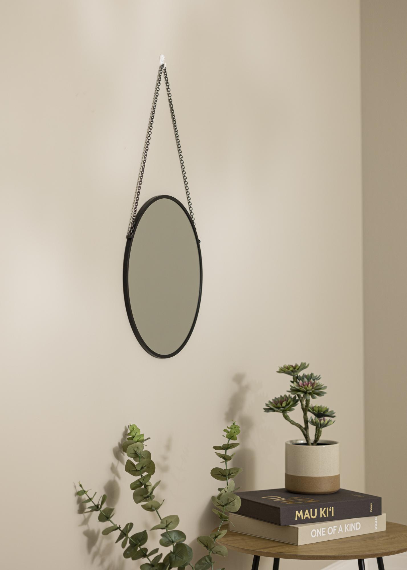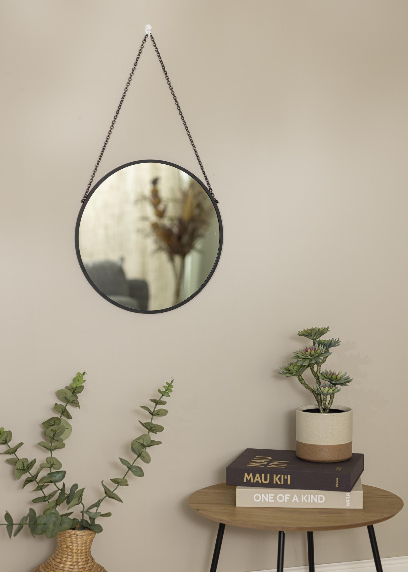 A mirror suspended by a decorative chain has an exclusive look that adds style and charm to any room. This round wall mirror comes with a black metal chain that perfectly matches the black metal frame. The frame is only 8 mm deep making it sleek and elegant in appearance.