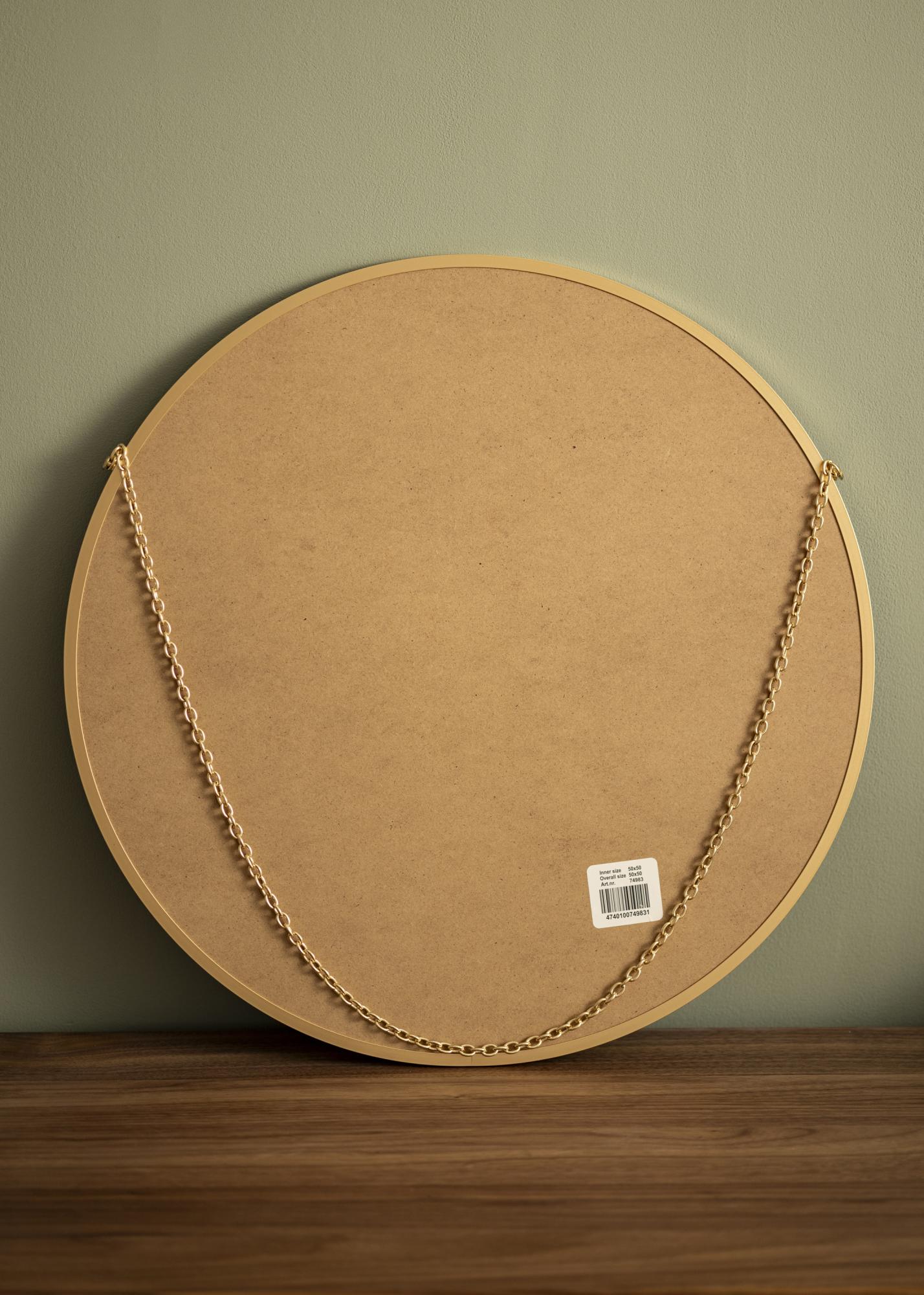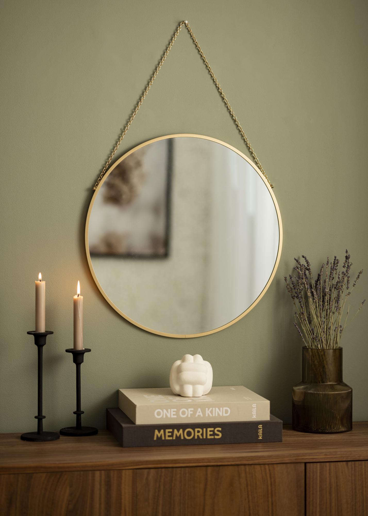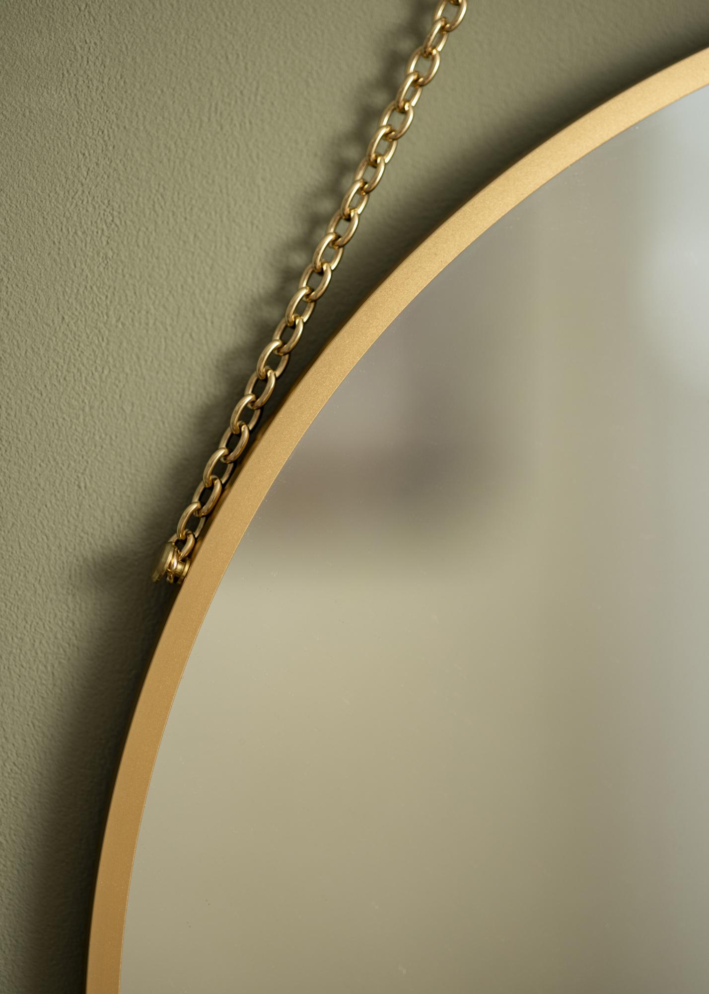 Add a touch of elegance to your home with this beautiful wall mirror! Its circular shape and depth of only 8 mm give this mirror a sophisticated appearance. The frame, which is made from metal, comes in an exclusive gold colour as does the elegant gold chain used for hanging the mirror.